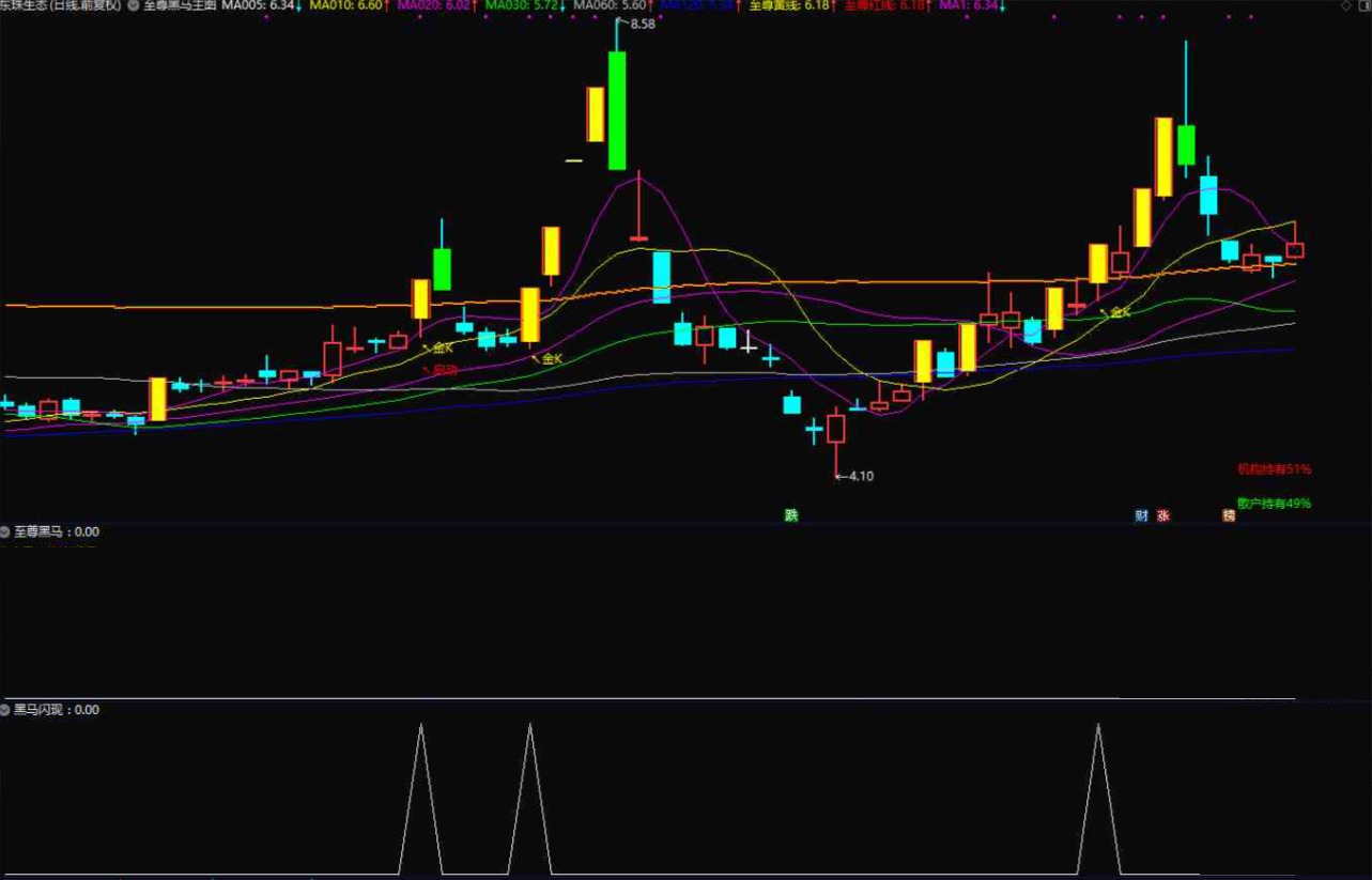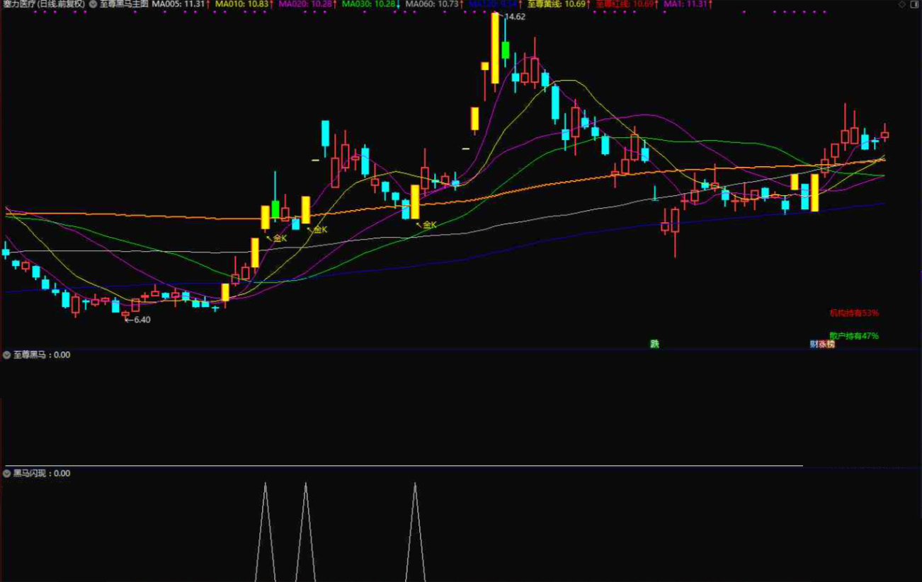 一个至尊黑马主图、一个至尊黑马副图、一个黑马闪现副图和两个配套的选股预警公式,共5个指标,实测全套指标无未来函数,加密,指标信号稳定,请放心使用。