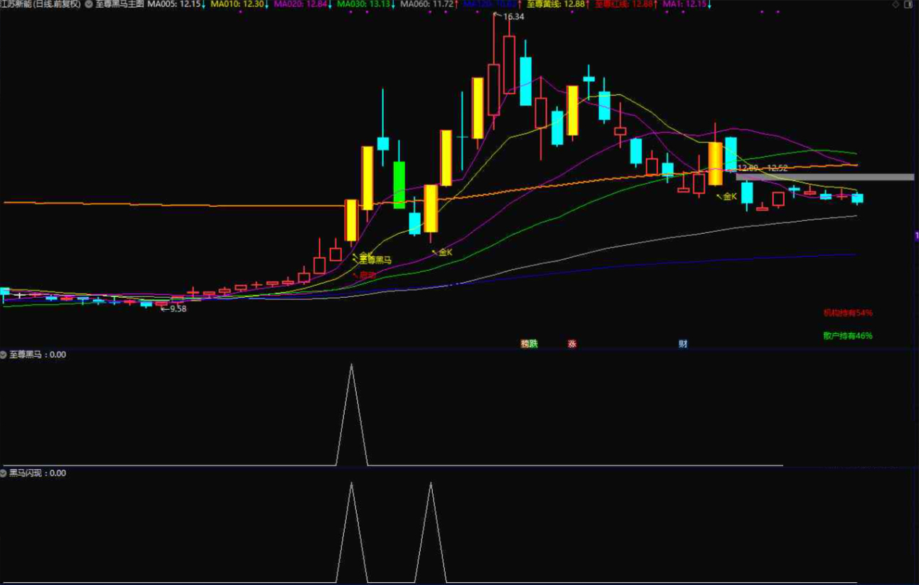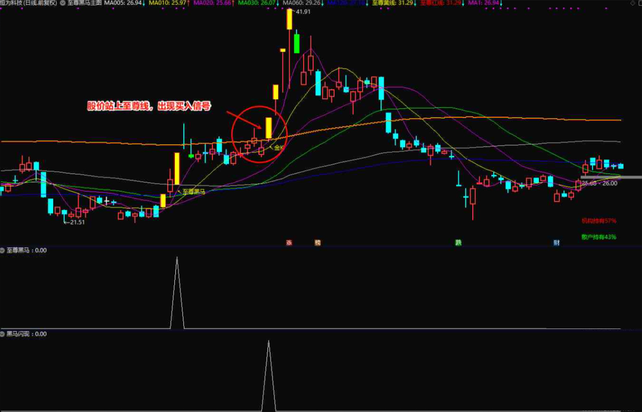 - 第一买点:股价站上至尊黑马主图的黄线,并出现至尊黑马信号为最佳买点;