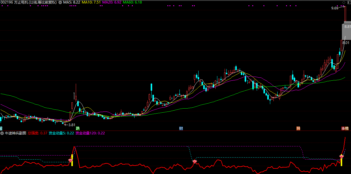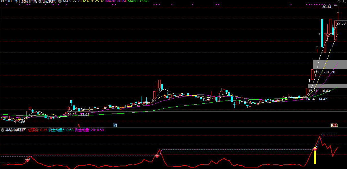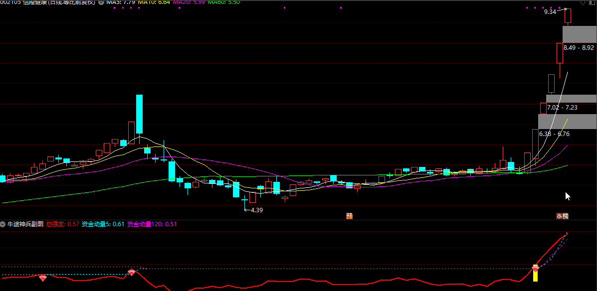 牛途神兵”指标,乃牛股必经之路。其借“多周期收益率差值、资金动量趋势及涨停板强度验证”这 三重维度构建交易信号体系 ,达成“趋势确认+资金推动+量能爆发”的复合判定机制。