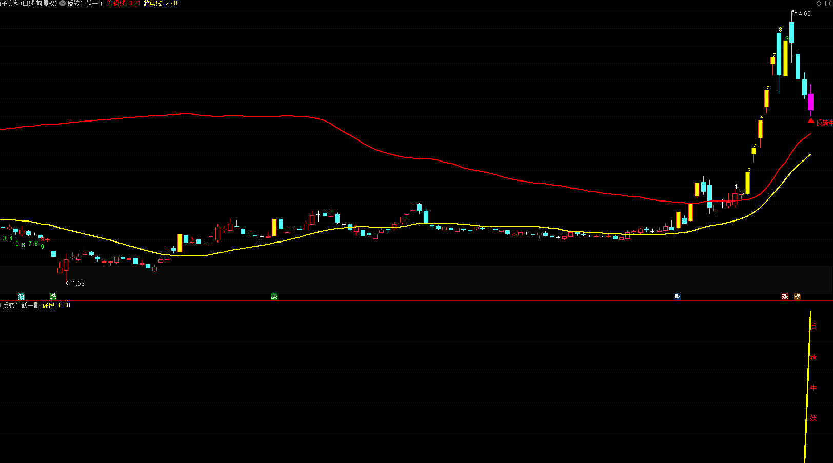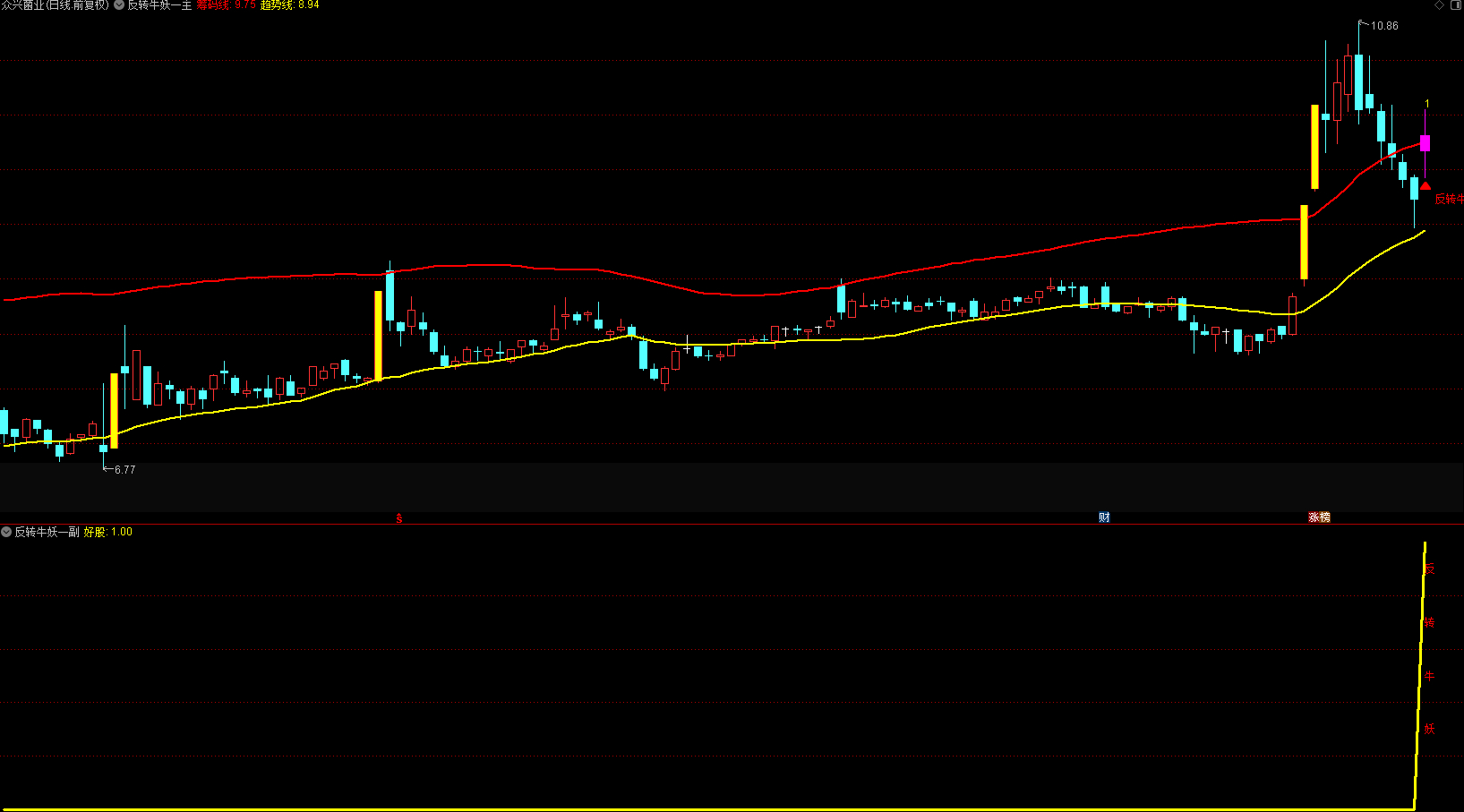 指标通当满足均线多头排列、股价突破均线、近期有涨停记录且技术指标(HG15)显示强势时,会在图表上标注“反转牛妖”信号(黄色柱状线+红色文字提示),提示潜在强势股机会。核心操作策略是捕捉均线共振与短期爆发力的结合点。
