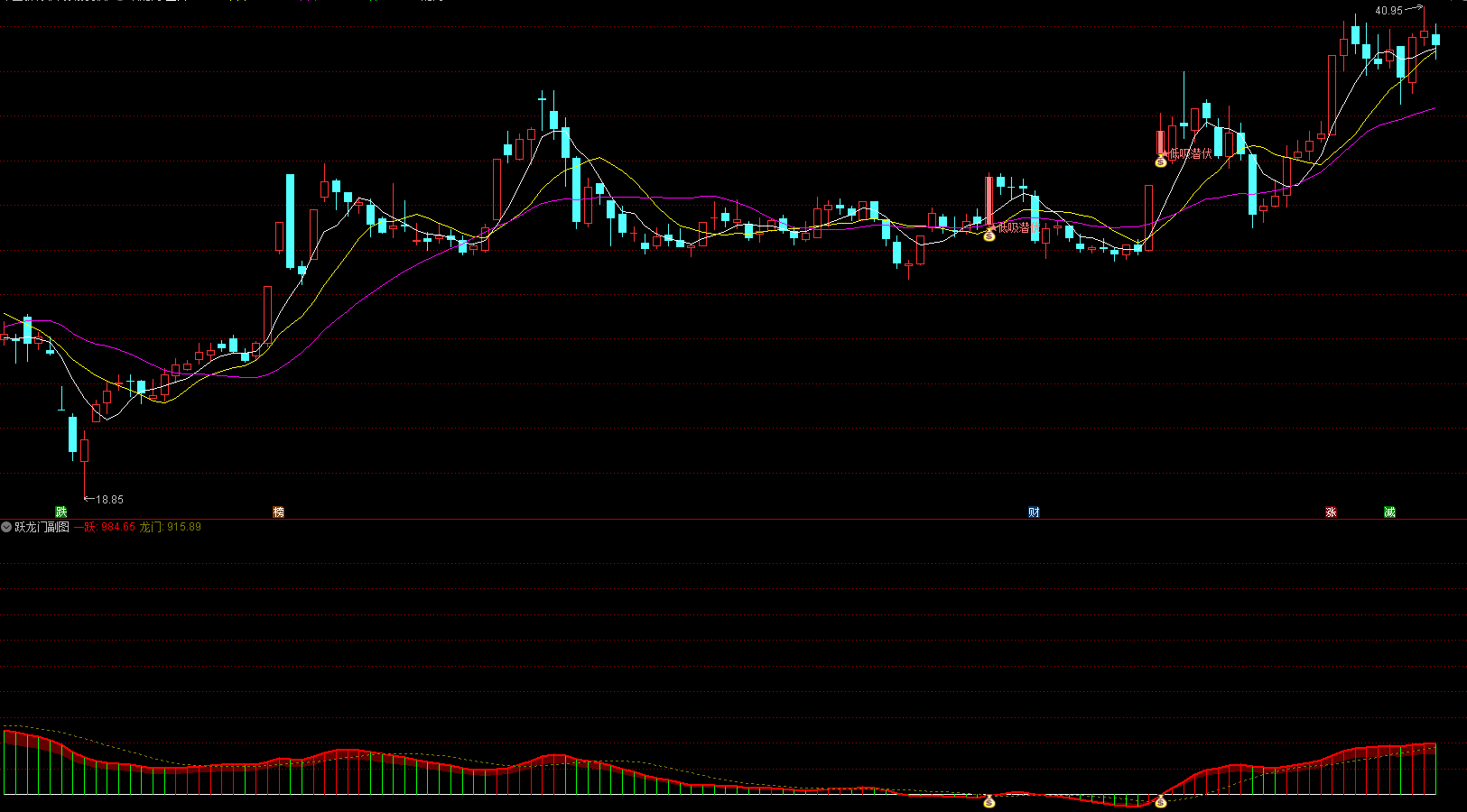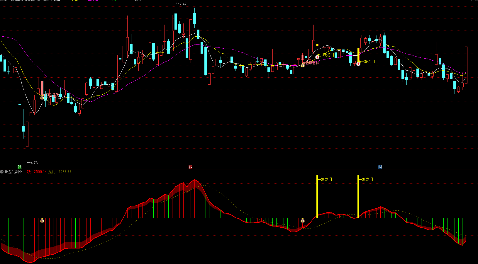 操作上,可关注“一跃”柱线由绿转红及黄色信号提示的突破机会,结合“龙门”均线方向过滤假信号。