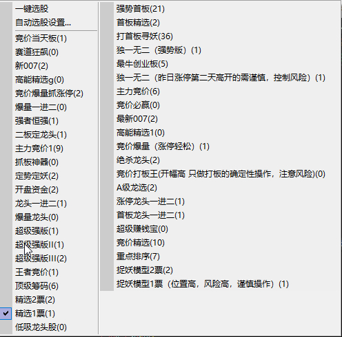 金甲量化9.99全套指标、广西炒家首板王系统、九啸寻龙至尊旗舰版全套指标、封龙擒牛全套指标、散人竟价8.55系统指标、游资擒龙系列指标、竞价系统8.5终极版全套指标、竞价体系全套指标、龙头股道完整版指标等……