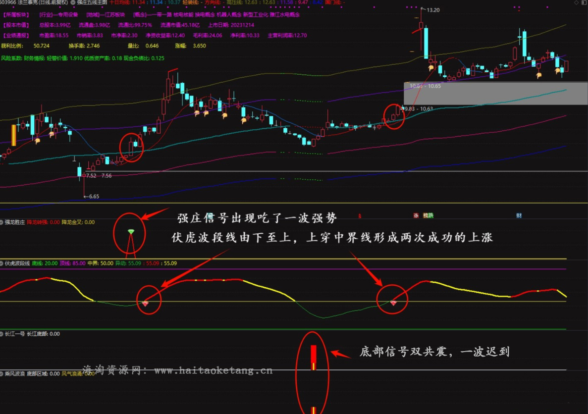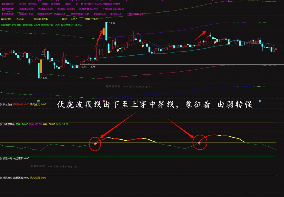 乘风破浪是各种底部的测量工具,股价调整到位,主力反补拉升,趋势扭转,以在底部区域里信号为主,与长江一号的信号共振,为最佳底部买点,可确保可观的后期利润结合伏虎波段线位置越低吃肉越多,历史大底不容错过。