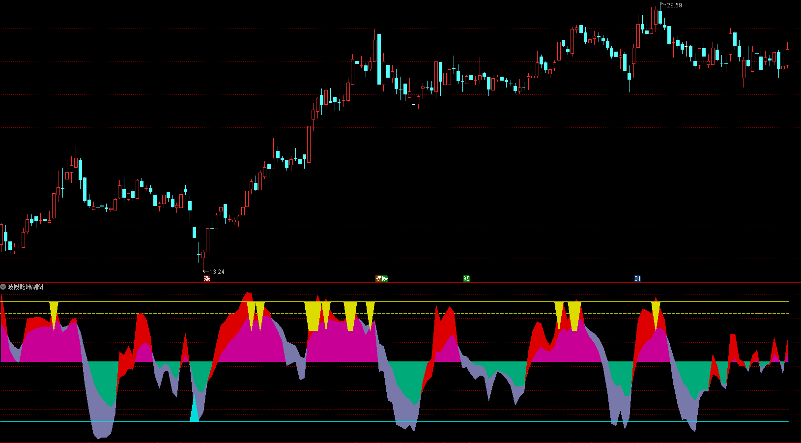 指标通过计算价格在特定周期内的相对位置,识别市场趋势和买卖信号。它在当前价格上下绘制多条水平参考线和彩色带状区域,直观展示支撑阻力位。当快线突破慢线时产生买入信号,下穿时则考虑卖出。
