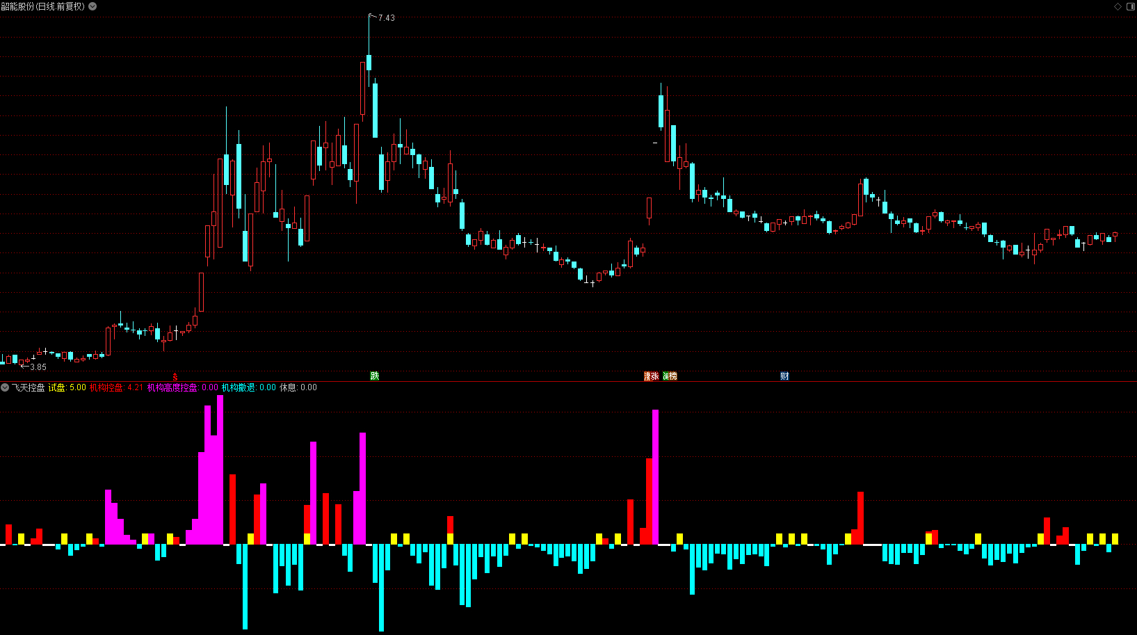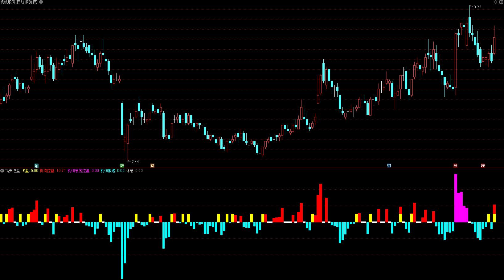 指标通过计算股价的双重平滑变化率来识别机构资金控盘状态。主要功能是监测机构资金的进场、拉升、出货和撤退四个阶段,通过不同颜色直观显示资金动向。