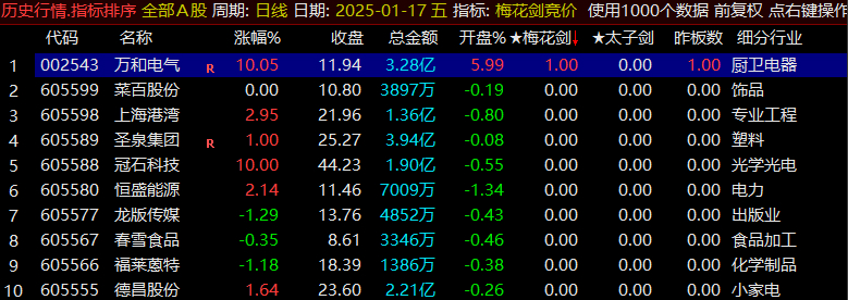2、优先使用梅花剑,关注排名第一的个股,不是每天都有信号,没有信号关注后面的太子剑排序。