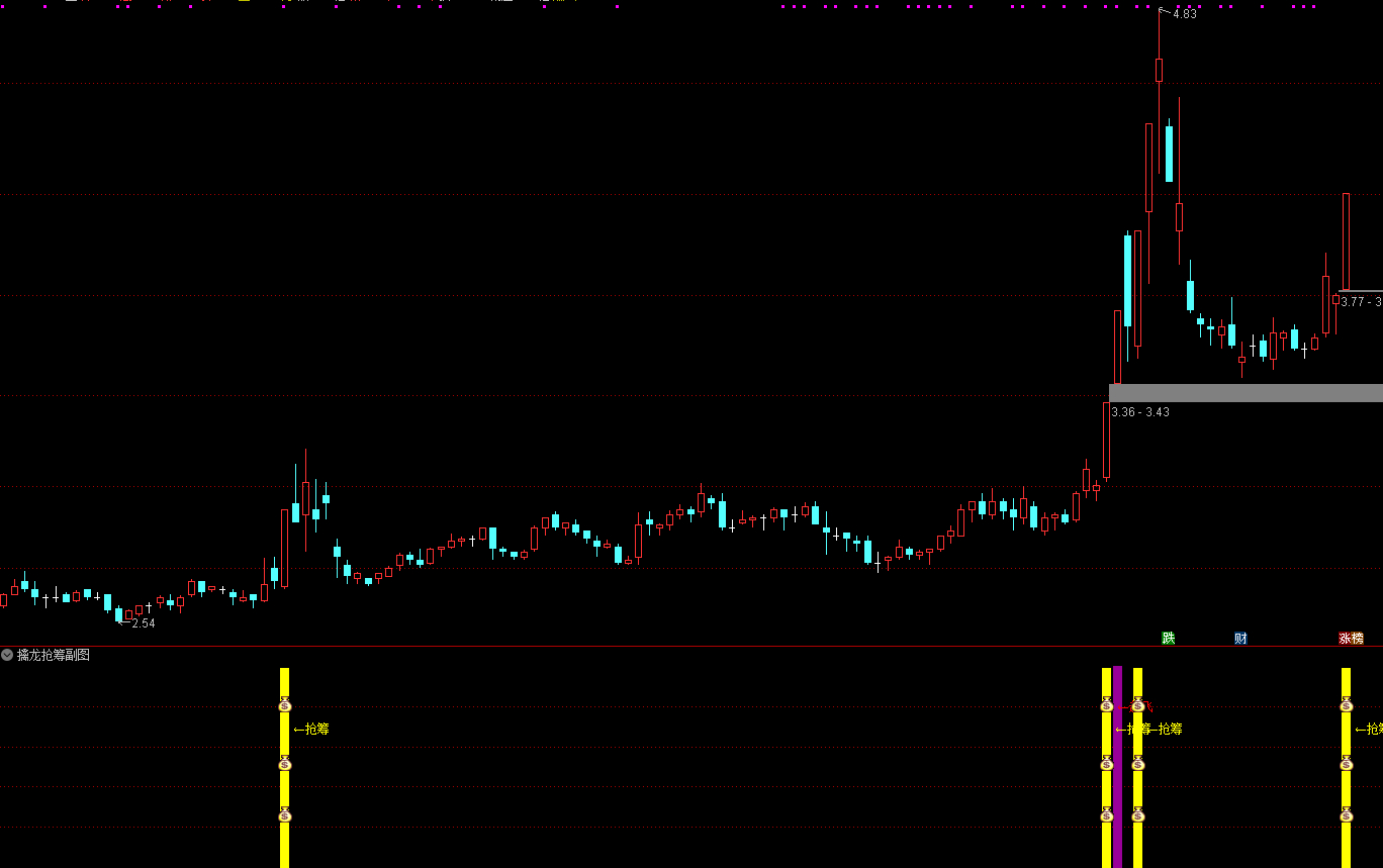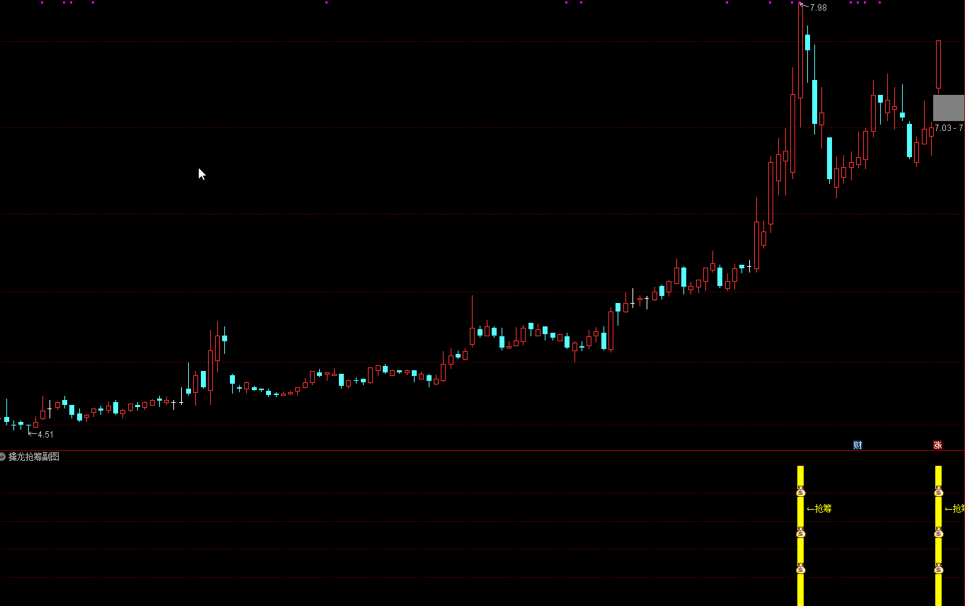 副图黄色柱子现钱袋子信号,标志擒龙指标主力介入启动,此时主力有强力拉升意图,需结合热门概念综合判断提升胜率。