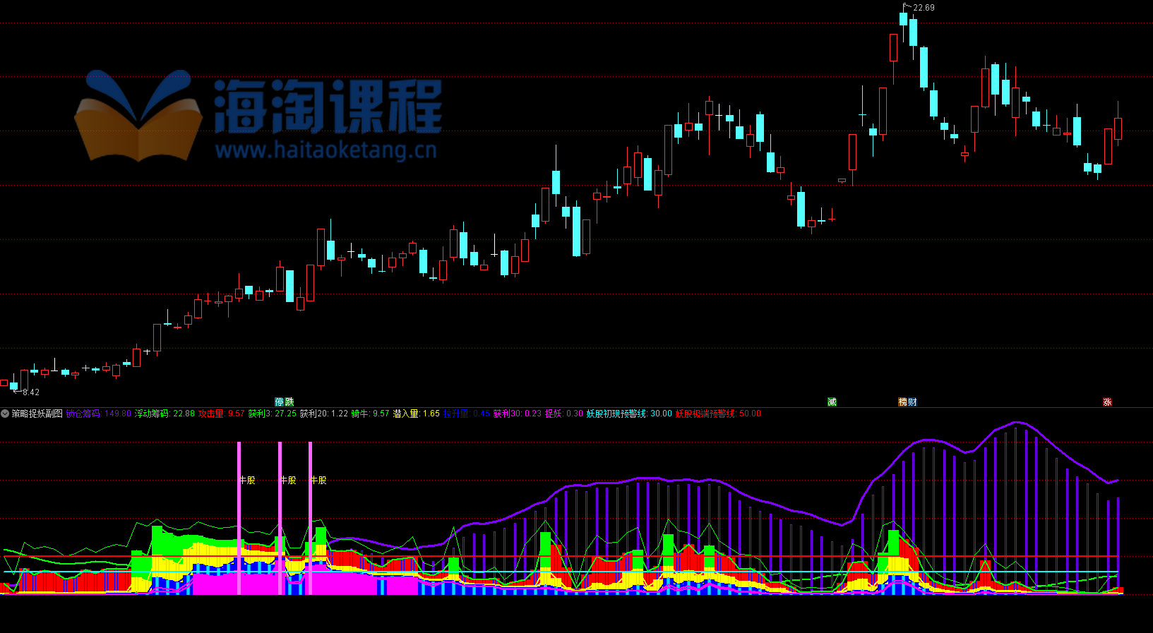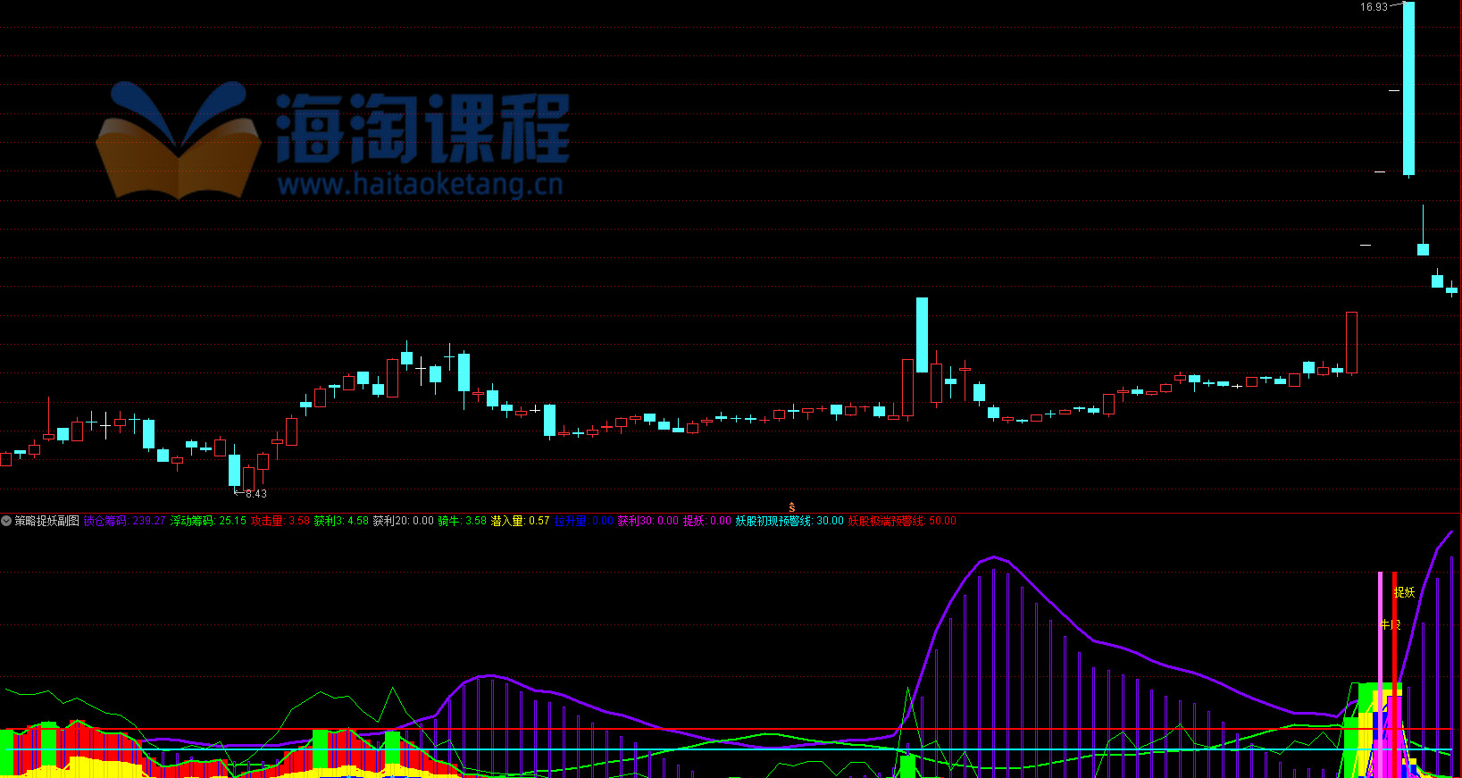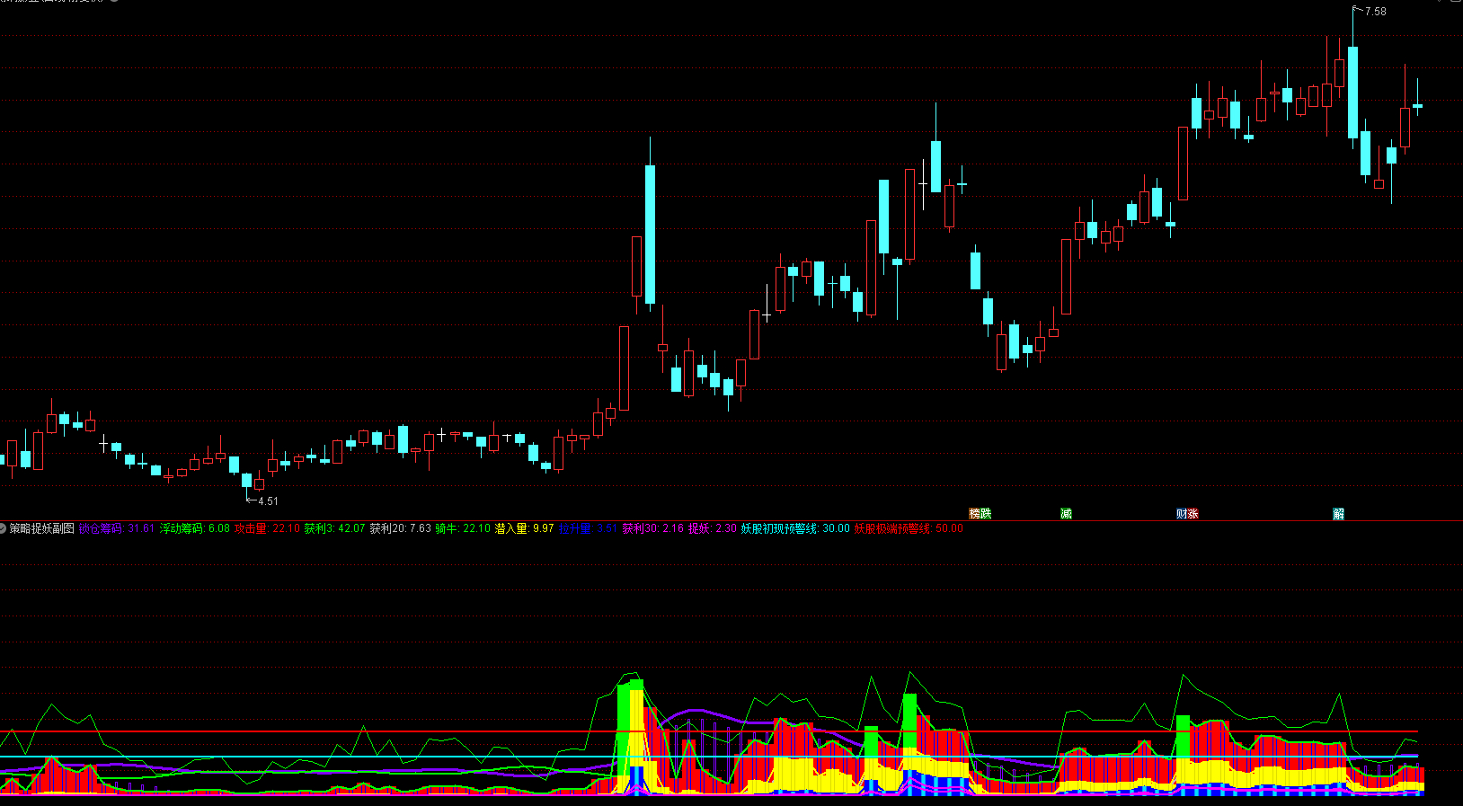 指标通过分析不同价位区间的持股比例变化,识别主力资金深度介入的股票。核心功能是监控”捉妖线”突破关键阈值来捕捉强势启动信号,并用筹码集中度判断锁仓力度。操作策略是当指标突破第一道预警线时关注,突破第二道预警线时视为强烈买入信号。