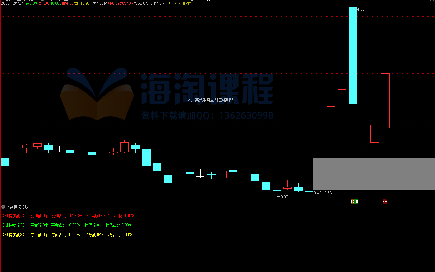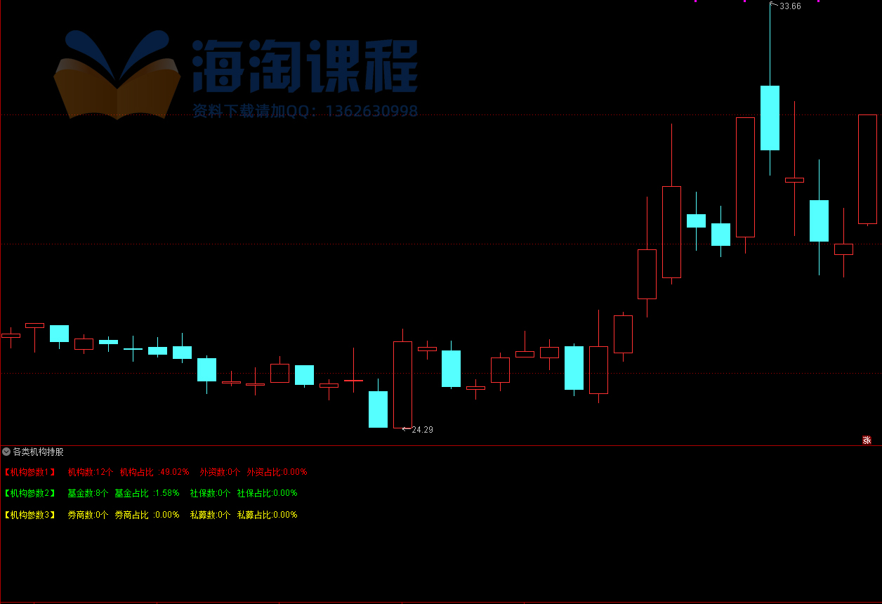 指标源码主要用于在图表上固定位置展示各类机构投资者(如基金、社保、券商、私募、外资等)的持股数量及其占总股本的比例。通过调用财务数据函数,实时汇总并以文字形式清晰呈现不同机构的参与程度,帮助投资者快速了解个股背后的主力资金构成。操作策略上,可结合各类型机构的持仓变化判断市场信心与资金流向,辅助决策是否跟进或规避。