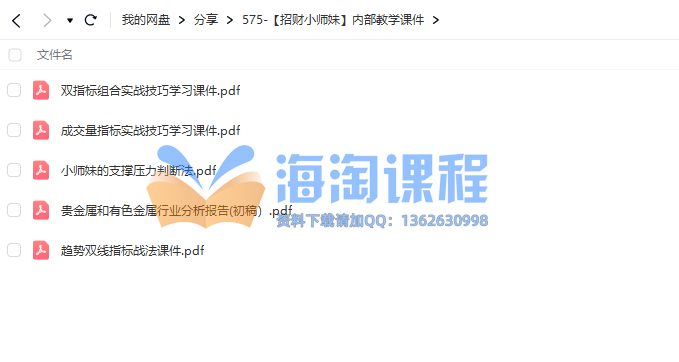 【招财小师妹】内部教学课件资源简介: 课程目录: 成交量指标实战技巧学习课件.pdf 趋势双线指标战法课件.pdf 双指标组合实战技巧学习课件.pdf 小师妹的支撑压力判断法.pdf 贵金属和有色金属行业分析报告(初稿).pdf 升级VIP 所有资源免费下载价格9.9 学分包年VIP免费升级包年VIP立即购买点击购买支付成功后,就会弹出下载连接 客服QQ:1362630998资源大小:18.7 MB更新时间::2025-12-22观看方式::百度网盘下载看路径:haitao20119/分享/575-【招财小师妹】内部教学课件状态:已上传到百度网盘 原文链接:https://haitao.nincuo.com/caijinglicai/49225.html,转载请注明出处。 0 0