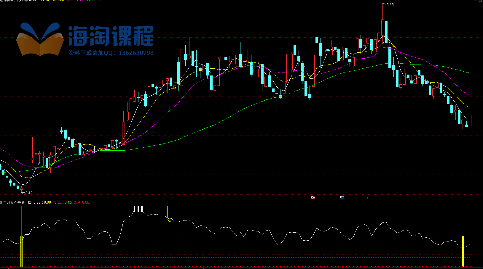 指标综合了价格动量、市场情绪与趋势结构,主要用于识别短期超跌反弹机会。通过衡量上涨与下跌力度的比例判断市场强弱,并结合动量指标、均线系统及极端偏离值,筛选出具备反转潜力的低位买点。当多个条件共振时,发出红色“选股”信号,提示可关注介入时机;同时设有高位警示(“减”字)和低位区域标识,辅助仓位管理。