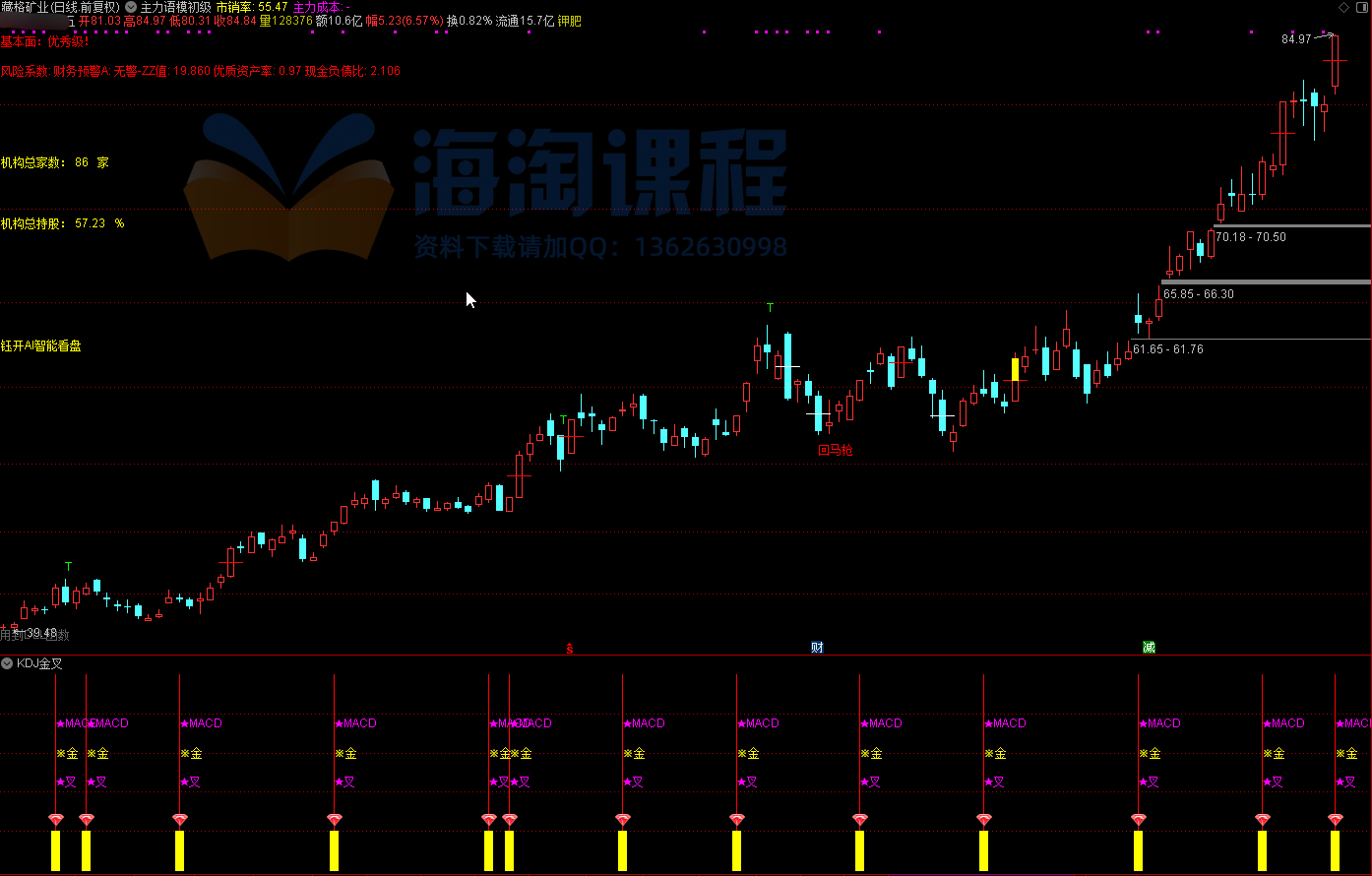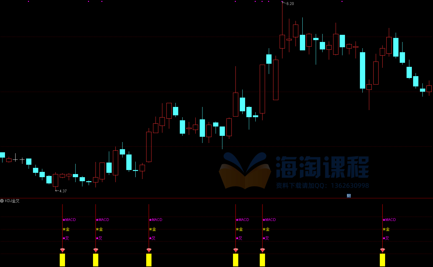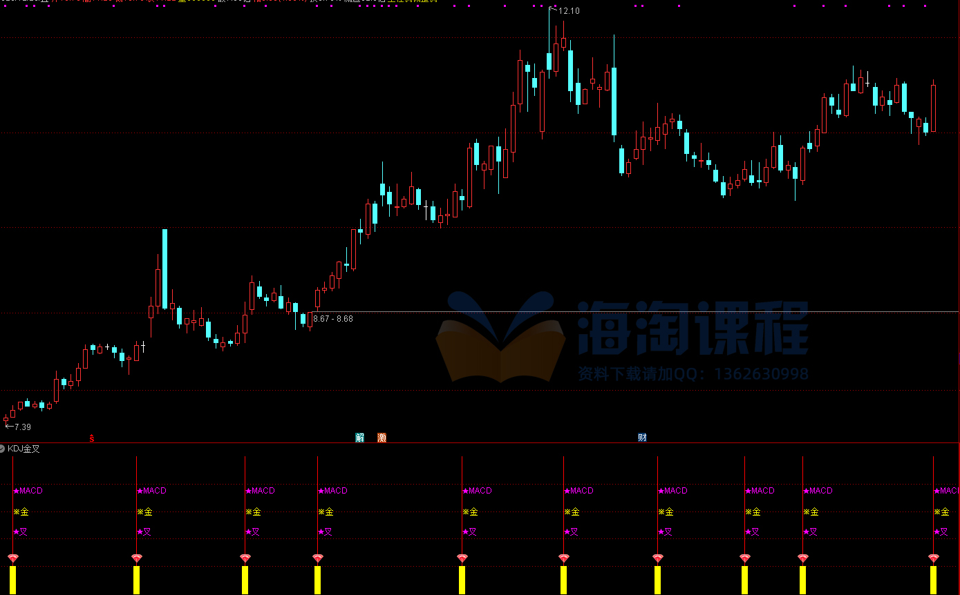 指标源码主要用于周线级别的多维度技术分析,融合了均线、MACD和KDJ三种经典指标。通过判断短期与中期均线的交叉、MACD快慢线的金叉,以及KDJ指标中K线与D线的交叉,综合识别潜在的买入信号。当三者中任一出现金叉时,系统会在图表上以彩色柱状图和文字图标进行视觉提示,便于投资者快速捕捉周线周期中的趋势转折点。