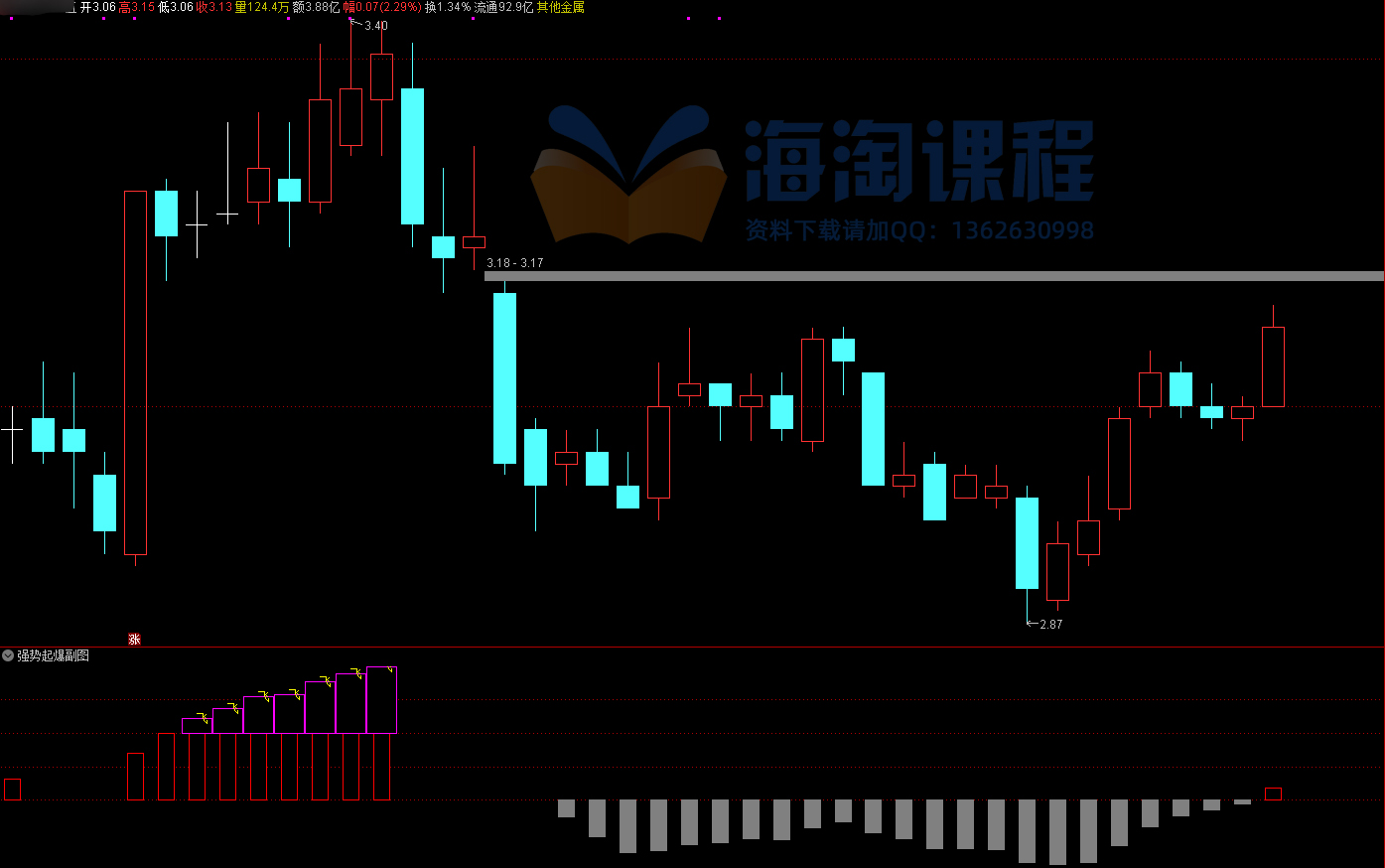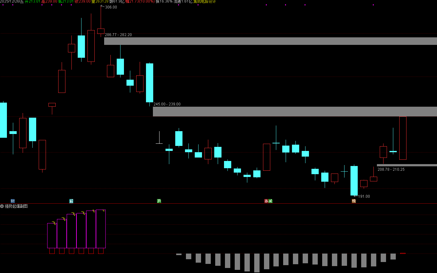 指标通过双重平滑的均线变化率,衡量股价动能的强弱与加速状态,识别潜在的强势启动点。当动能由负转正并持续增强时,以不同颜色和形态的柱状图区分强度等级;同时结合长期价格位置的相对强弱指标,一旦其快速上穿高位阈值,即触发“强势起爆”信号,并在图上标注提示。整体策略聚焦于捕捉趋势初起、动能放大的关键节点,适合用于追强或突破类交易。