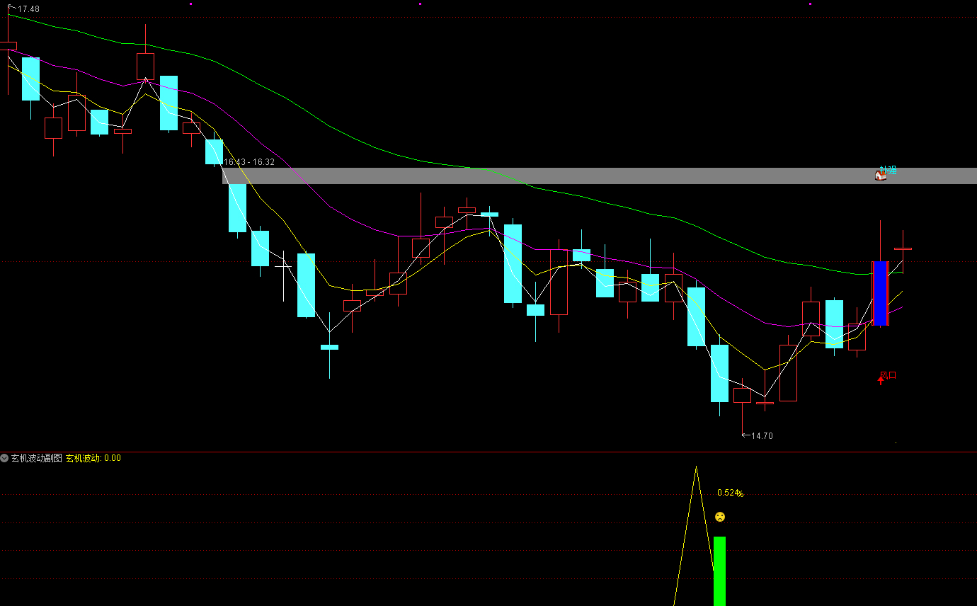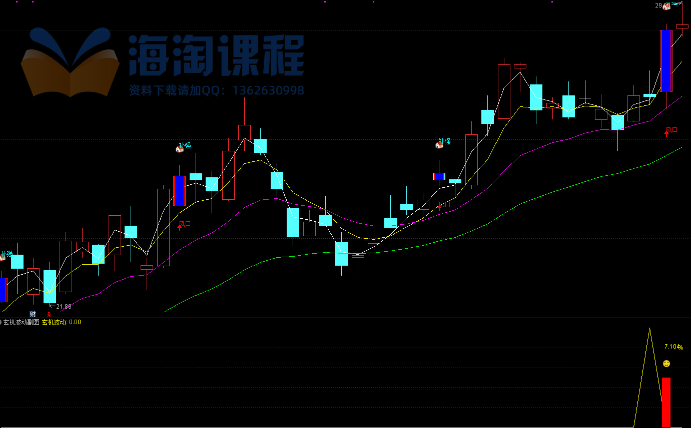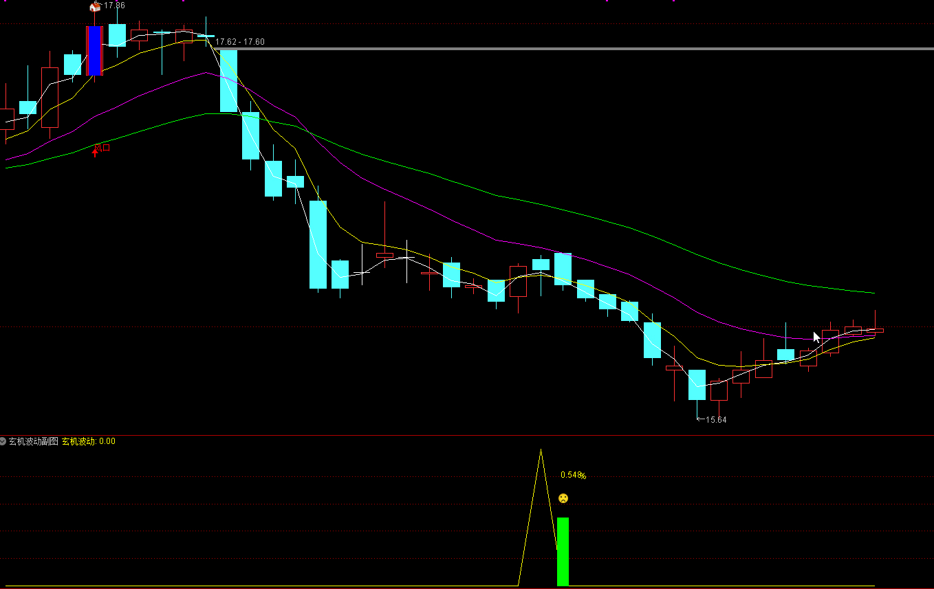 1.玄机波动指标针对尾盘使用,信号三天前的收盘价不高于加权均价,两天前收阴线且收盘价低于加权均价,昨日收阳线收盘价≥加权均价,当天收阴线。