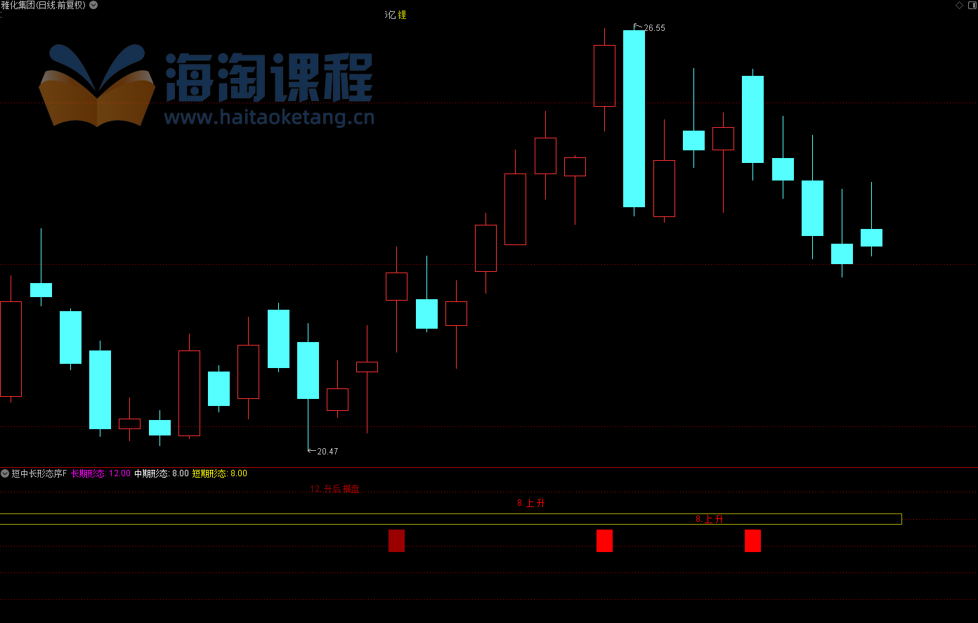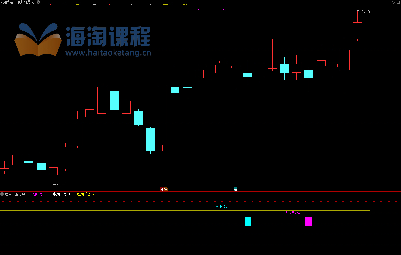 - 2. 公式自动在K线图右侧显示三组形态标识——分别对应短、中、长期;