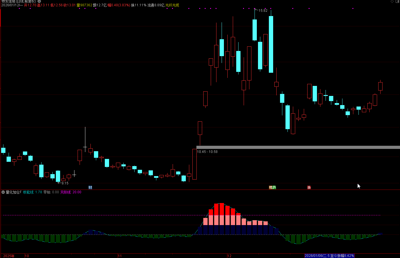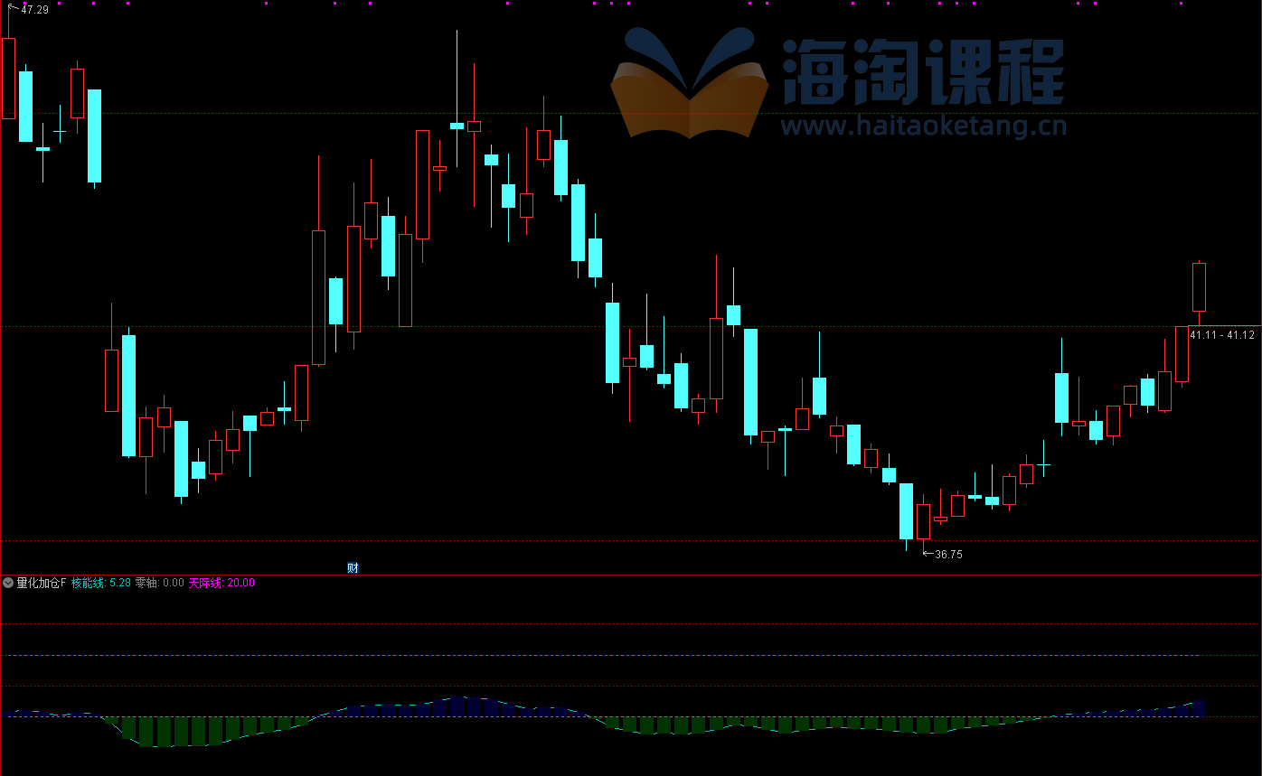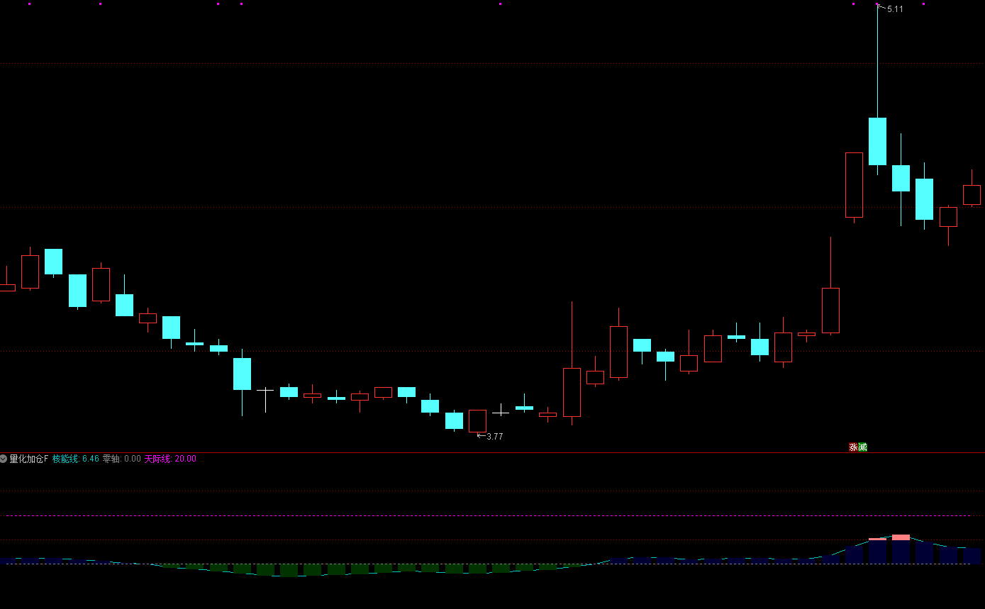 指标结合价格偏离均线的程度与随机指标(KDJ)的平滑值,构建出“核能线”和“量化资金”两条核心曲线,用于判断市场趋势强弱与资金动向。当趋势向上、资金线上穿核能线且成交量明显放大时,触发“暴力加仓”信号,提示强势介入机会;当核能线从低位上穿-15时,提示“潜伏”布局;若核能线高位下穿资金线,则发出“减磅”警戒。整体策略侧重于趋势确认、量能配合与高低位反转信号。