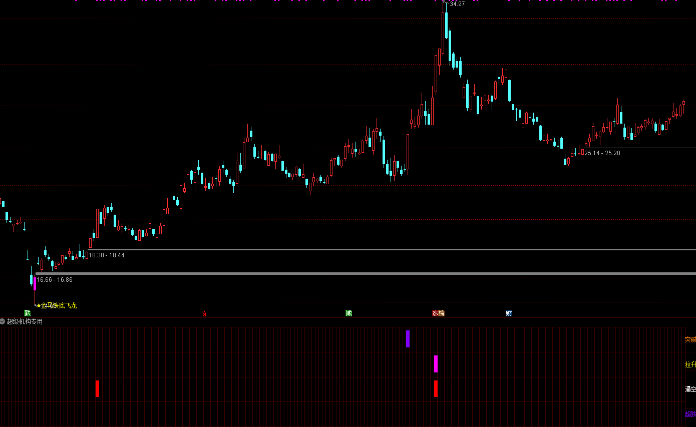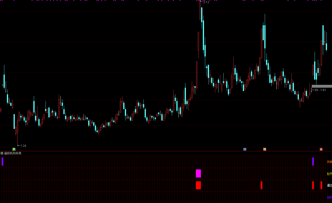 指标主要用于识别涨停(或接近涨停)股票中的不同强势类型,结合价格、均线系统、相对强弱、筹码分布及历史高点突破等维度,将涨停股分为“突破”“拉升”“逼空”“超跌反弹”四类机会。策略核心是在个股出现强势涨停时,判断其背后驱动逻辑——是突破压力位、趋势加速、资金逼空还是超跌反弹,从而辅助短线交易者精准分类介入。