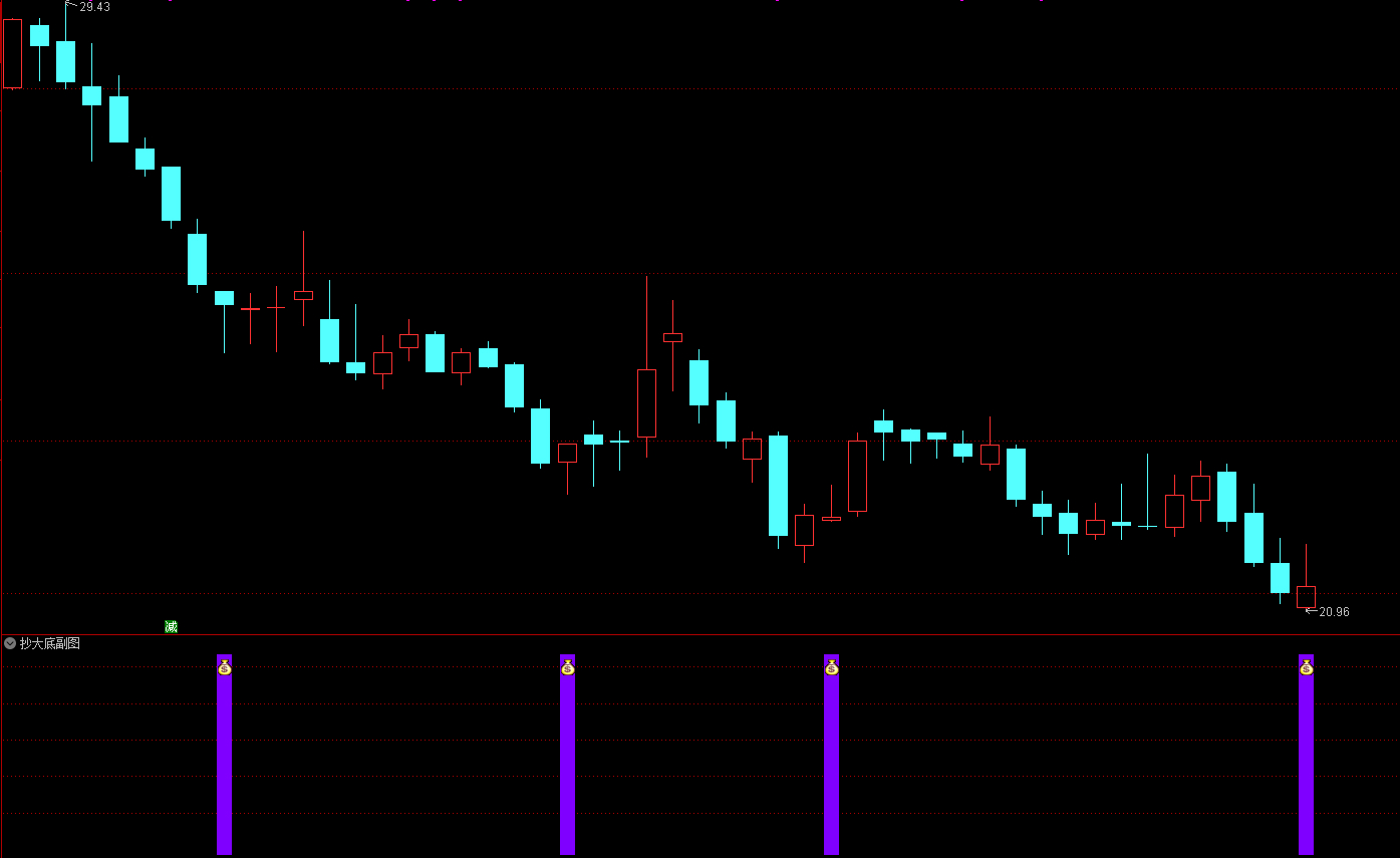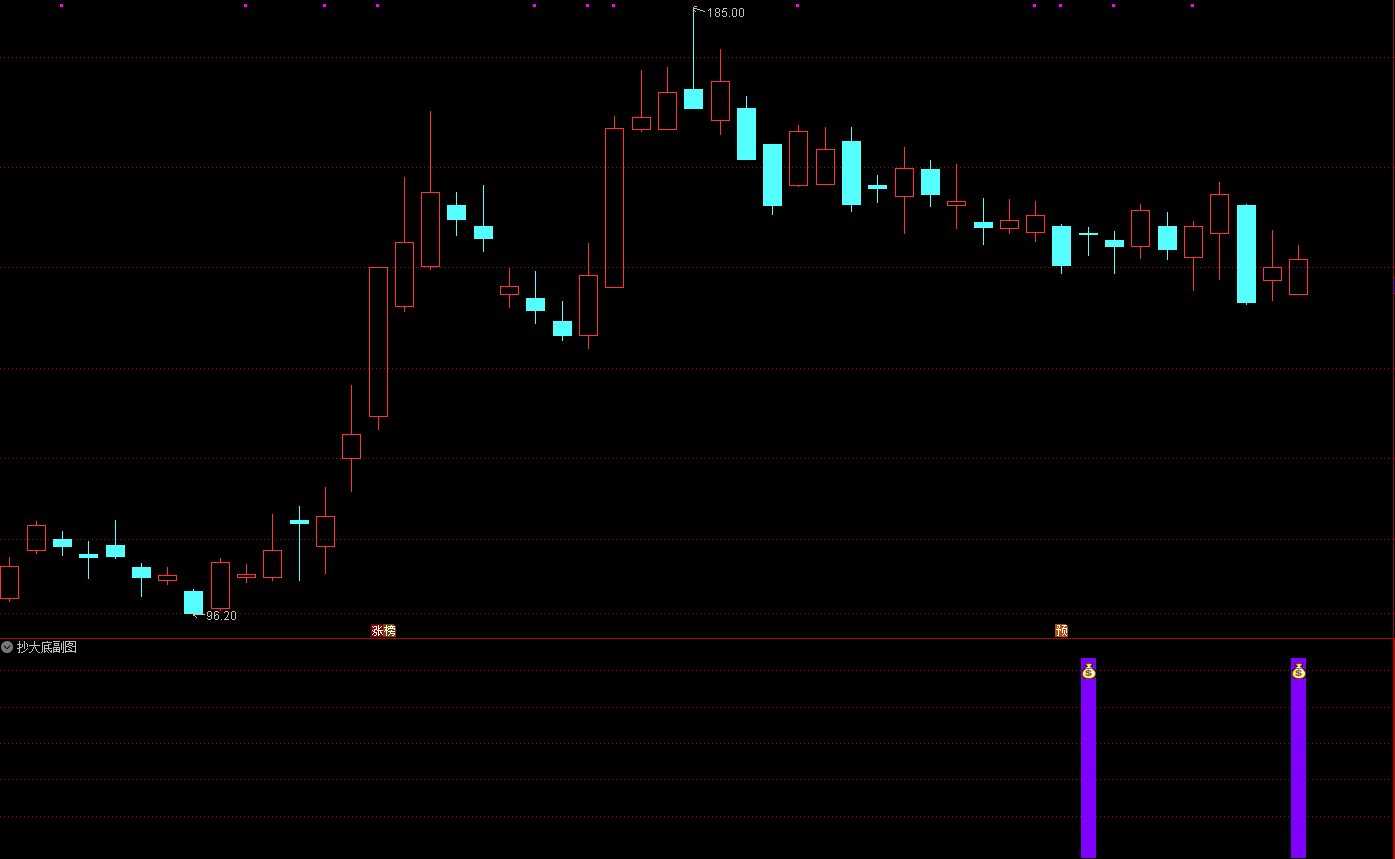 指标主要用于识别股价处于阶段性超跌区域、可能形成重要底部的买入信号。它综合了价格在近期高低点区间的相对位置、短期趋势动量变化以及市场平均成本与波动偏离程度,当多个条件共振——如动量开始拐头向上、价格远低于成本线、且市场情绪极度低迷后出现修复迹象时,系统会以彩色柱状图和图标提示“抄大底”机会。适合用于捕捉中短线反弹或反转的早期入场点,需结合其他确认信号使用以防假信号。