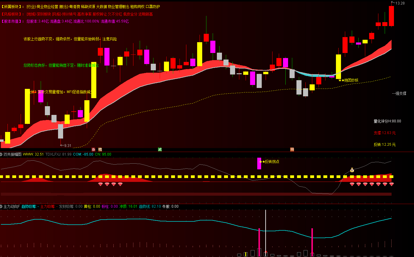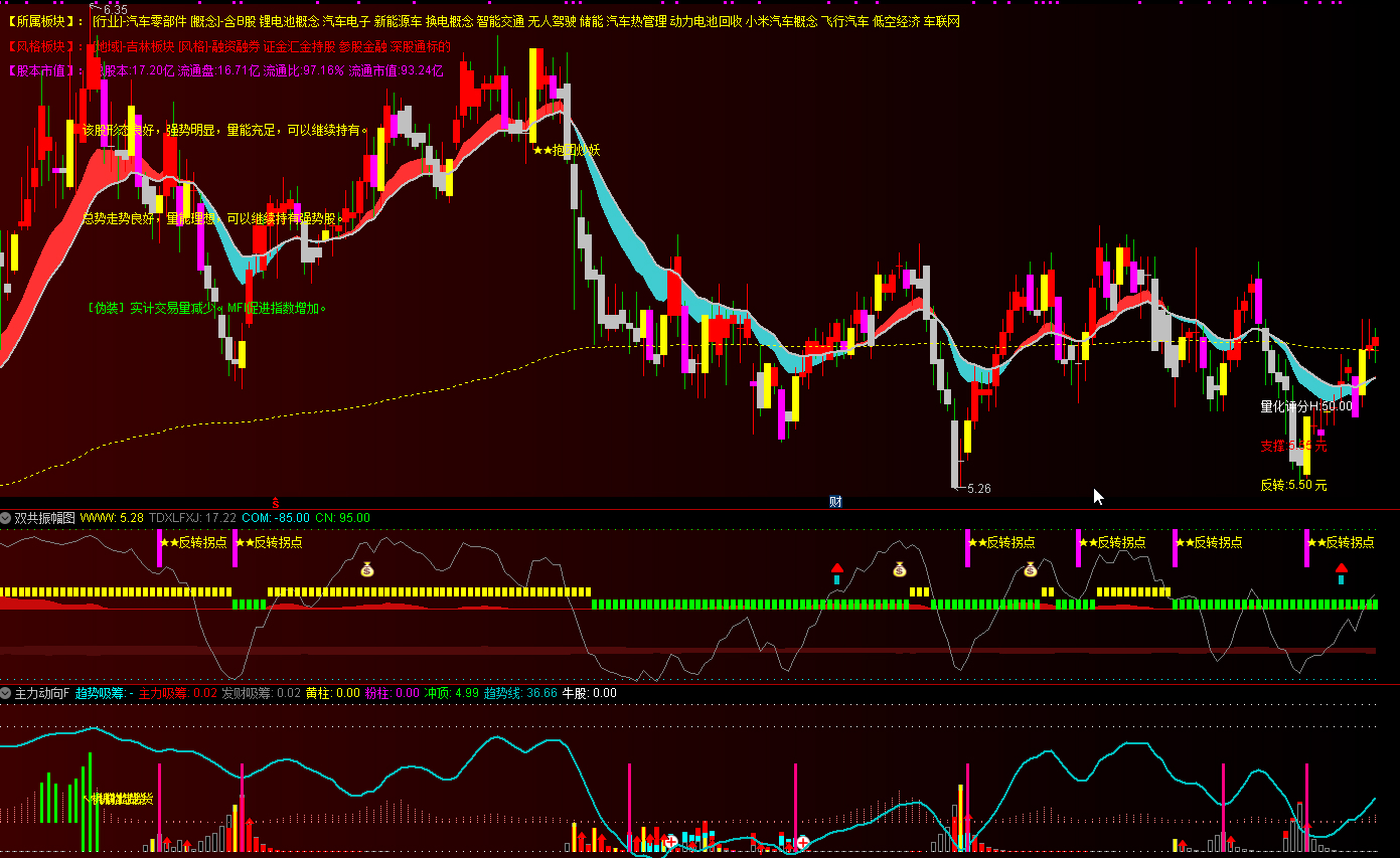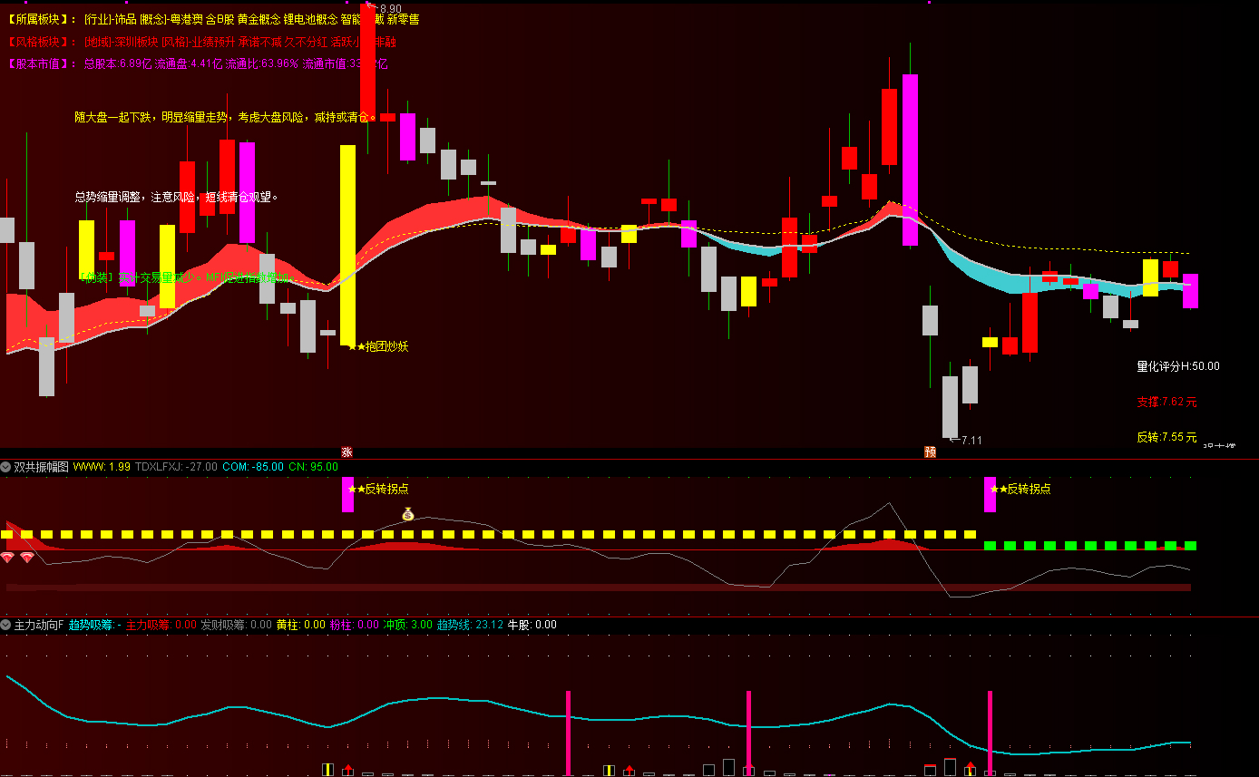 实战利器:“主力神器主图”融合K线、板块信息、业绩数据、支撑阻力、连板识别及多维趋势判断,实时标注持股/观望信号;“双共振副图”通过量价结构与能量控盘模型,叠加金叉共振提示启动时机;“反转拐点选股”则聚焦短期超跌后的强势反转信号,结合均线多头排列过滤假信号。三者联动,可高效识别主力介入、趋势转折与妖股启动节点。