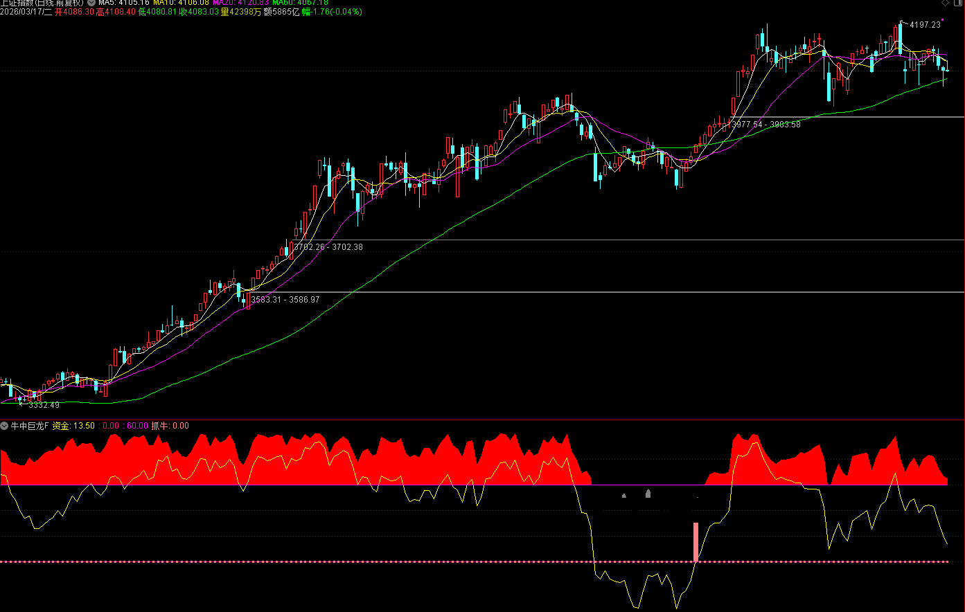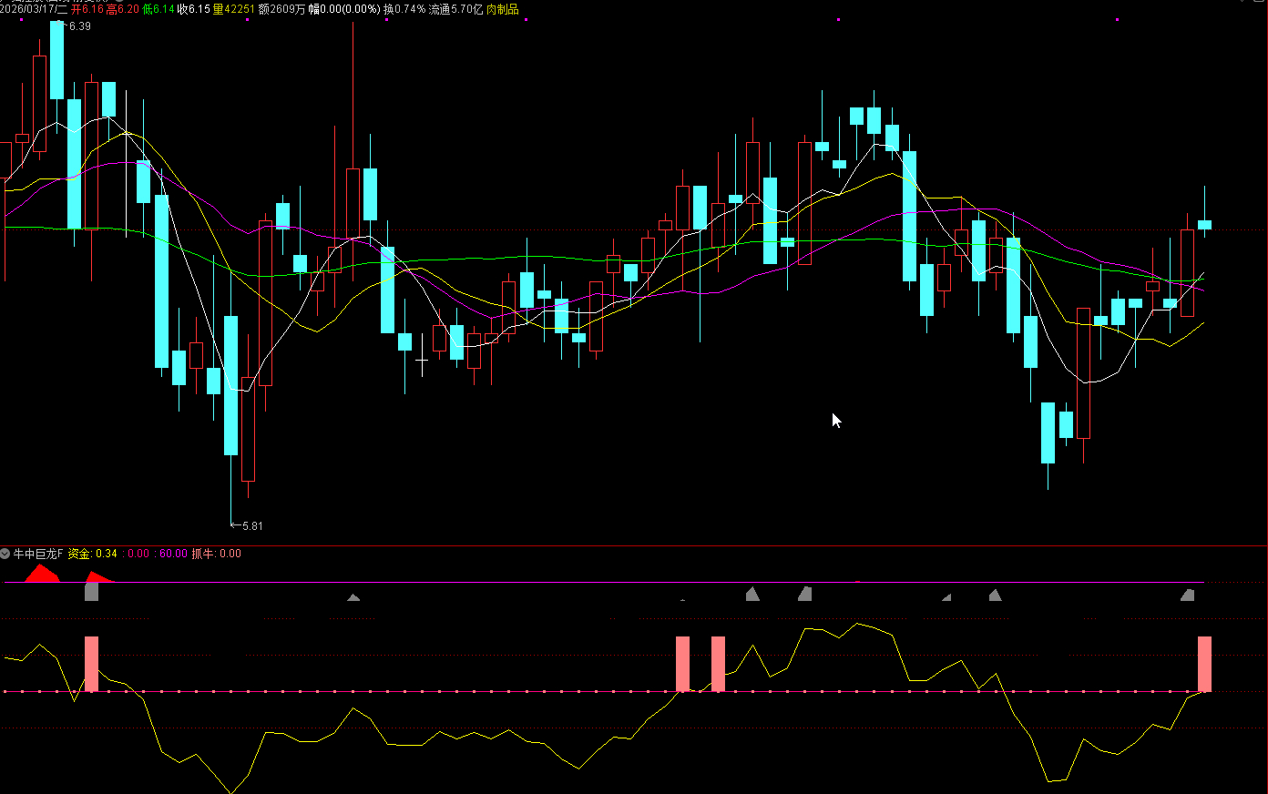 强势捕捉:副图中的粗红线(抓牛信号)专门用于捕捉股价出现大幅上涨(通常伴随涨停或大阳线)的时刻,提示用户可能遇到了短期爆发力极强的“妖股”。
