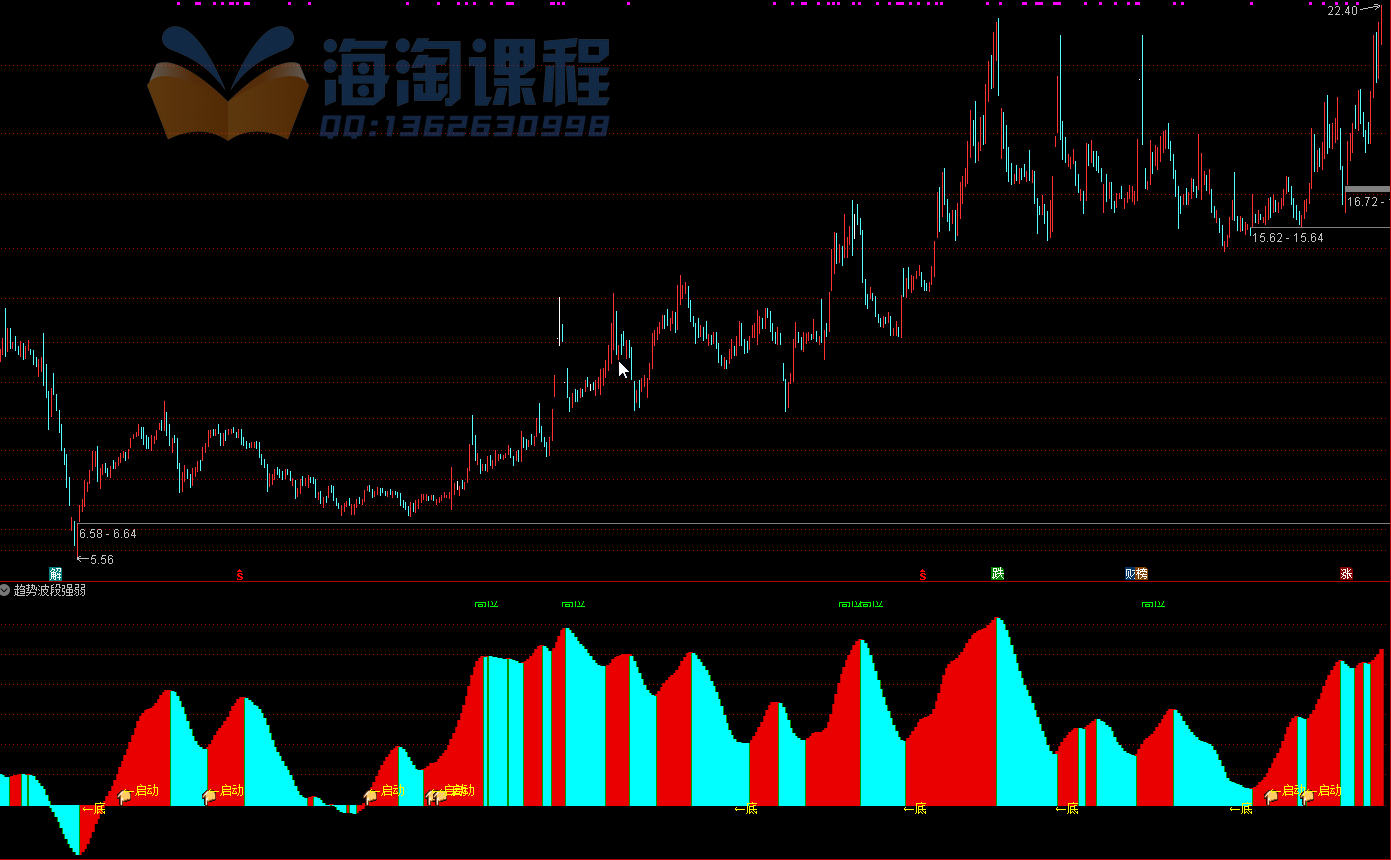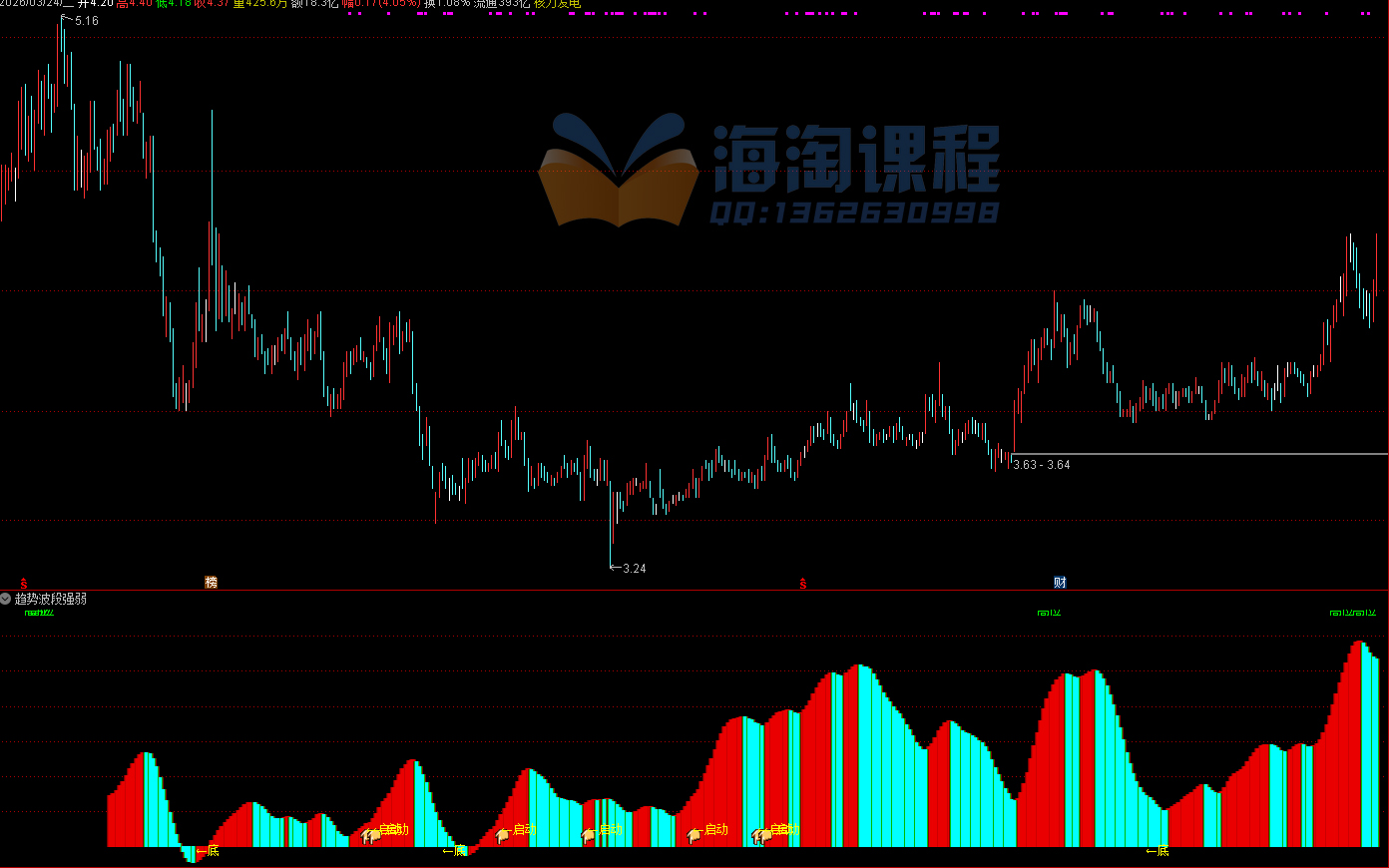 指标是一个综合性的趋势与买卖点提示系统。主要功能是通过多重均线、波动率及资金流向算法,判断股价所处的相对高低位及趋势强弱。操作策略上,当出现彩色柱状体由绿转红或数值上升时,代表多头动能增强,可视为持股或买入信号;当柱状体转绿或数值下降,提示风险增加应考虑减仓。此外,指标会在超跌区域提示“底”部机会,在均线金叉且处于低位时提示“启动”信号,辅助投资者捕捉趋势反转点。