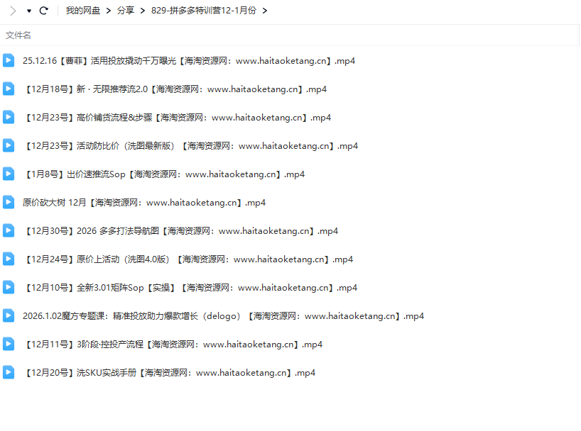 本套多多特训营12-1月课程,专为拼多多商家、运营操盘手打造,聚焦平台最新玩法与2026年运营趋势。课程涵盖全新3.01矩阵SOP实操方法,拆解从起量到盈利的3阶段控投产流程;深度讲解新无限推荐流2.0玩法,传授洗SKU实战技巧与最新版洗图防比价策略,助力实现原价上活动、高价铺货盈利。配套2026多多打法导航图与原价砍大树核心玩法,全程以实战为导向,覆盖流量获取、活动运营、成本控制全环节,助力学员精准把握平台红利,高效提升店铺业绩。