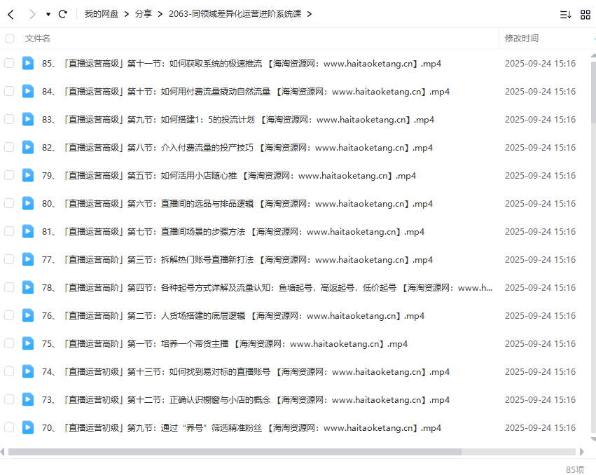 直播电商系统班 拍摄、剪辑、运营、直播系统课,同领域差异化运营进阶系统课资源简介: