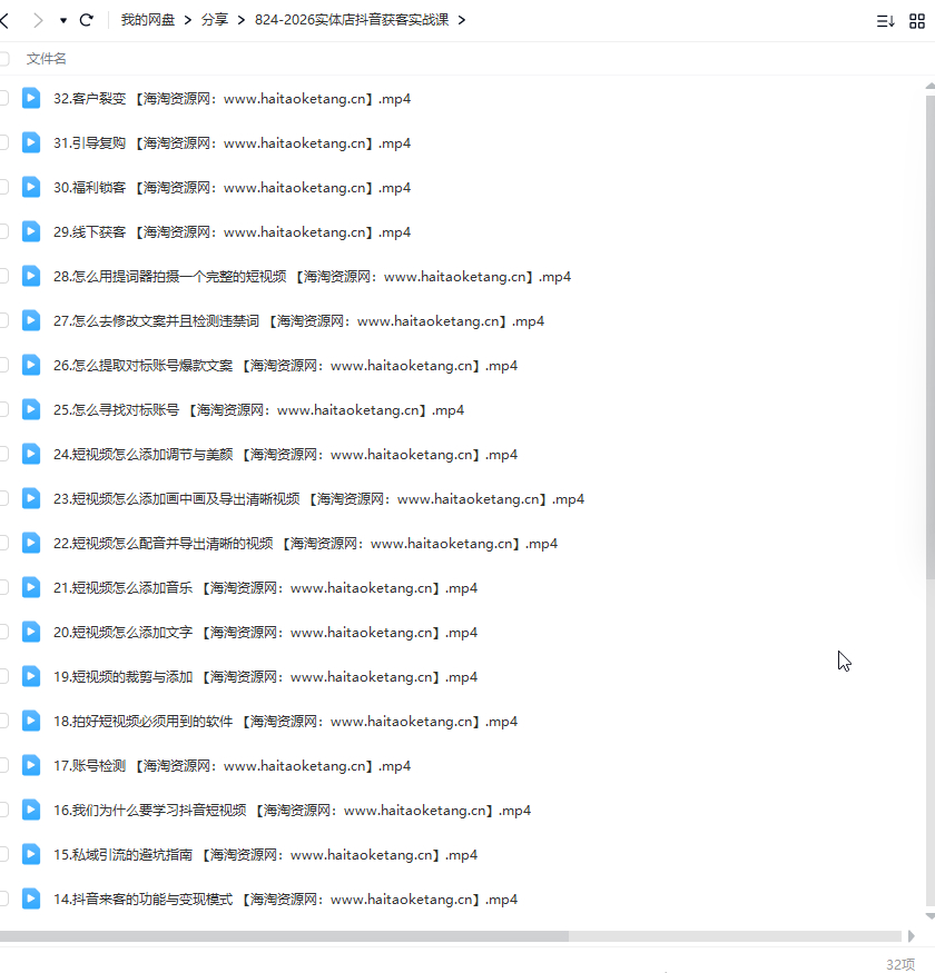 2026实体店抖音获客实战课,拍出能卖货的短视频,32节视频课教你你入门先搞懂变现密码和成交视频框架,再学拍摄技巧、引爆同城流量。你会掌握矩阵打法、企业号功能,连私域引流怎么避坑都讲透。更有剪辑、文案、提词器这些实操技能,学了就能用。这套课就是要帮你把抖音变成全天候的获客引擎,让老客复购、新客自来。现在开始,用抖音抢回生意主动权。