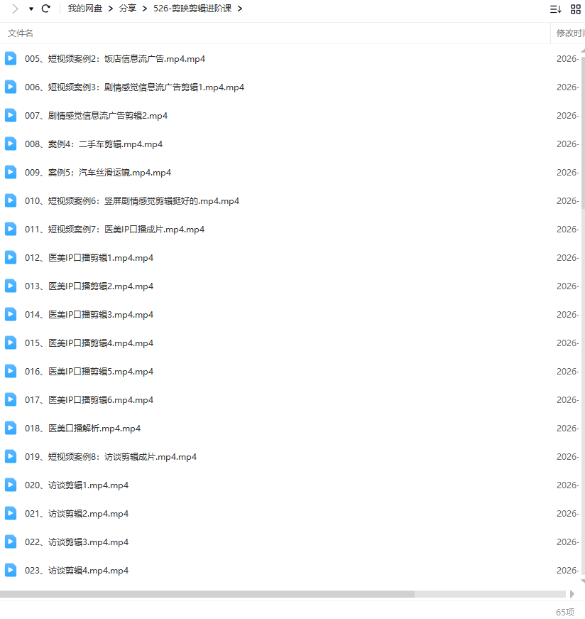 本课程是一套涵盖 187 节全实操的剪辑进阶课程,从基础剪辑逻辑到高阶技能全覆盖,适配剪辑新手、进阶者及想拓展技能的从业者,手把手带你从入门到全能。课程包含五大核心模块,覆盖短视频(美妆、汽车、医美、剧情等多行业)、横屏视频(旅拍、宣传片、军训等)全场景案例,拆解剪辑套路公式与工作流程,每类案例均有详细分步教学。