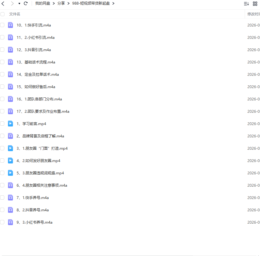 本课程《短视频带货新起盘》专注短视频 + 私域全域带货实战,从基础入门到完整起盘,手把手带你落地。内容涵盖抖音、快手、小红书三大平台养号、引流技巧;系统讲解朋友圈门面打造、内容发布、违规词规避等私域运营方法;提供基础话术、定金拉单、售后维护等全套成交流程;还包含团队部门搭建、人员要求与作业管理。课程全程干货、简单易懂,适合零基础想做短视频带货、私域变现的个人与团队,学完即可快速起盘、稳定引流、高效成交。