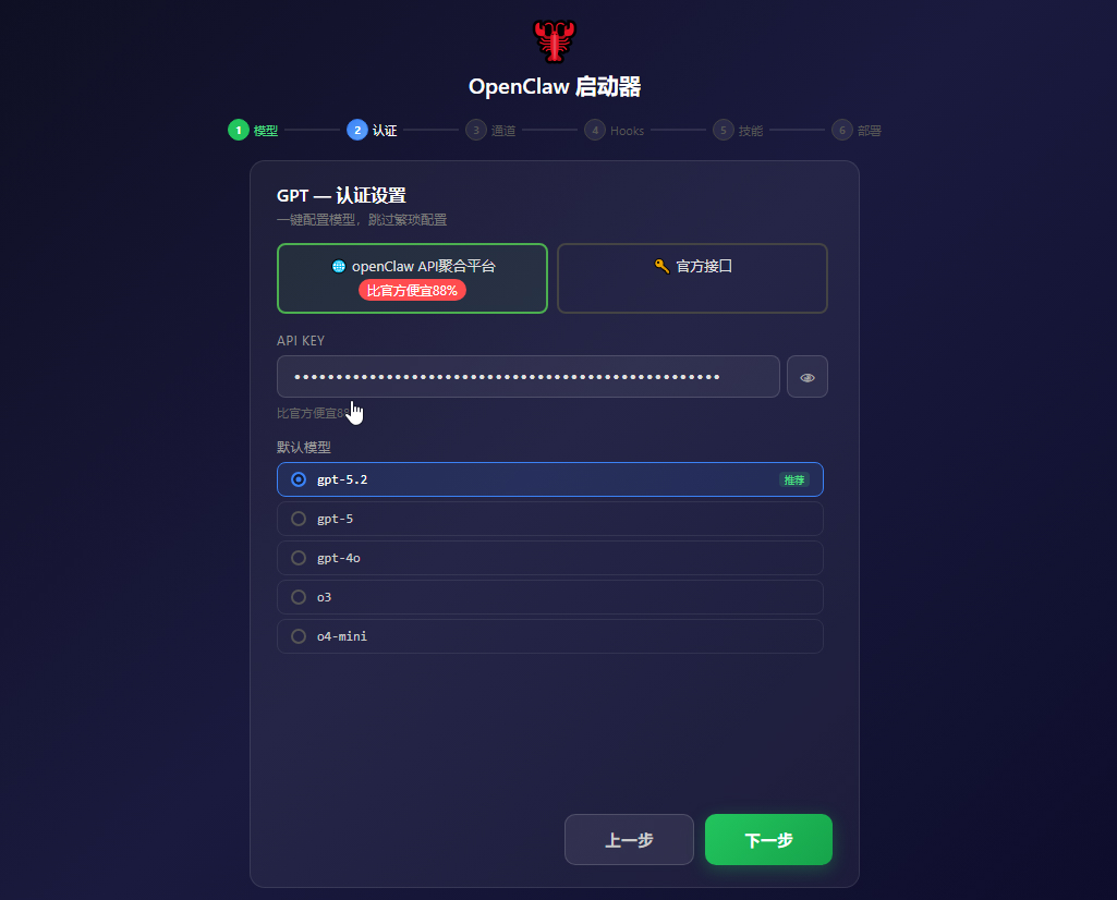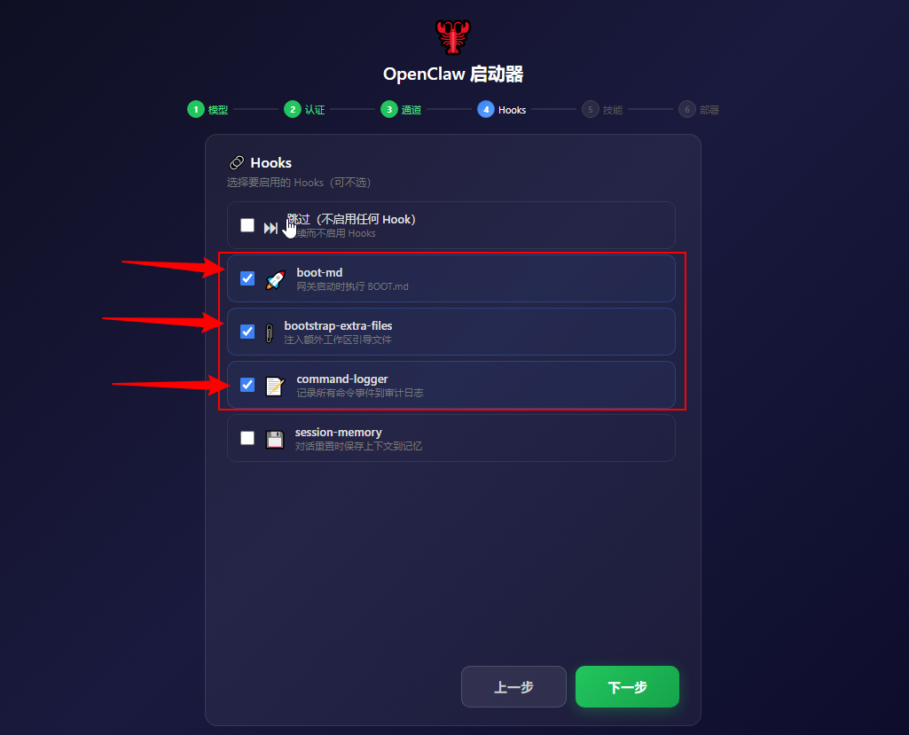 然后下一步 这个都是后面可以配置的 我们的目的是先要把龙虾跑起来。还是一样点暂时 跳过