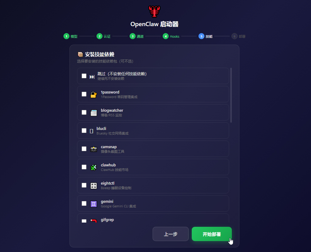 技能依赖先点跳过,不安装。后面都可以设置的