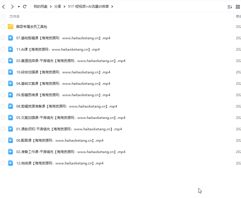 本课程是酷哥短视频+AI流量训练营,聚焦实战涨粉与变现。课程涵盖**课前须知、准备工作、赛道选择、基础文案与加强、配音课、基础剪辑与资源准备、剪辑思维课、综合加强课、AI课、完结课**等12节系统课。配套酷哥专属会员工具包,包含T子教程、创作者后台登录网址、封面制作教程、AI资源网站、资源下载网站、配音网站等实用资源,帮助学员系统掌握短视频创作与流量运营核心技能。