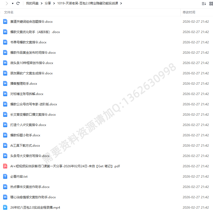 《豆包 2.0 商业隐藏功能实战课》是一套 2026 年最新 AI 商业变现课程,聚焦豆包 2.0 不为人知的高效功能。课程包含年初八实战全程录播与 AI + 短视频实体获客闭门课干货,配套海量可直接复制的指令模板:小红书 / 朋友圈 / 公众号 / 微头条爆款文案、爆款标题、评论区回复、个人 IP 打造、赛道选题、仿写优化等。同时提供豆包 AI 高级提示词指南、工具下载、对标拆解、小绿书玩法等全套资料。零基础也能快速上手,用 AI 批量产出爆款内容,实现自媒体变现、实体获客、效率翻倍,真正把豆包变成赚钱工具。